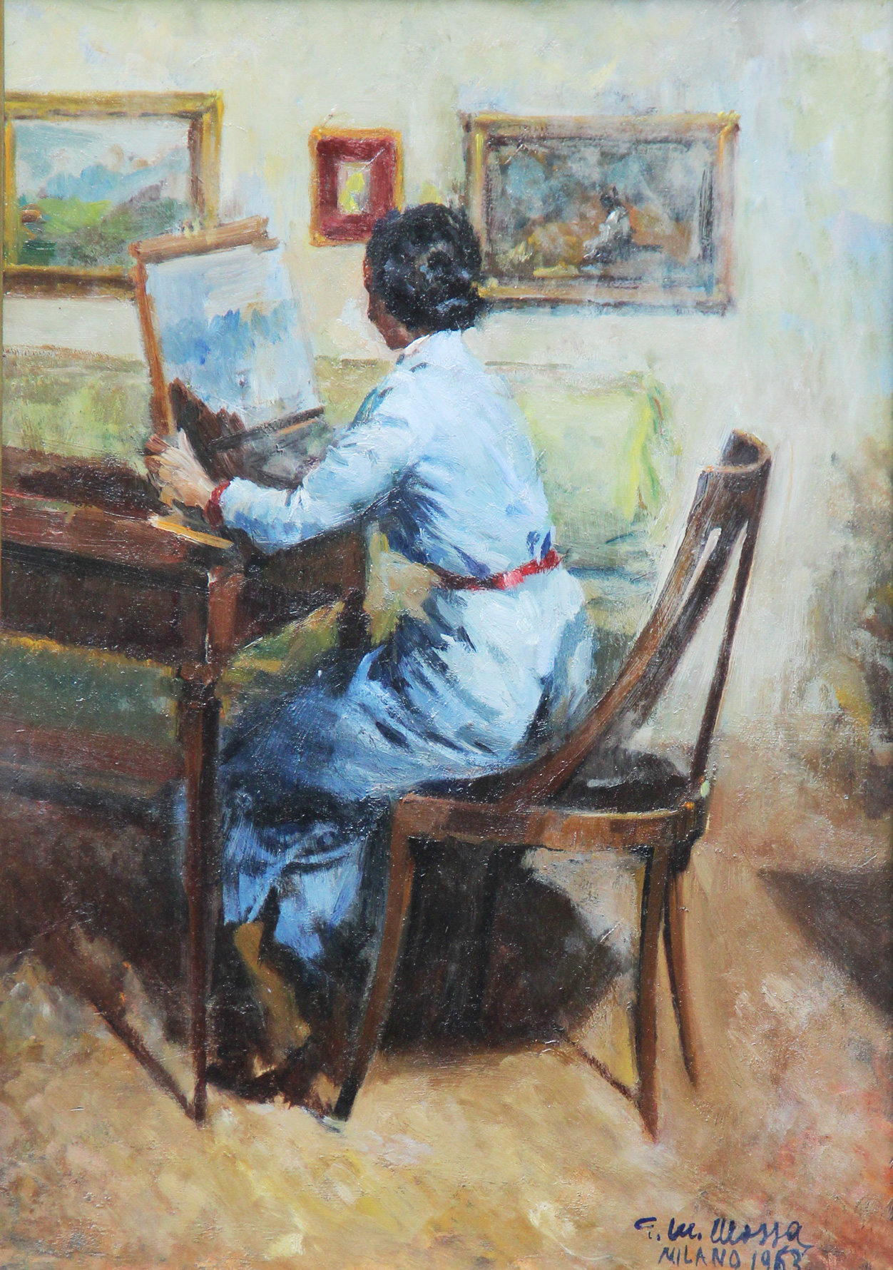 MOSSA Giovanni Maria, Figura di donna 1963 olio su tela cm. 35 x 25, . . Firma, luogo, data "G.M. Mossa, Milano, 1963" (in basso a destra)