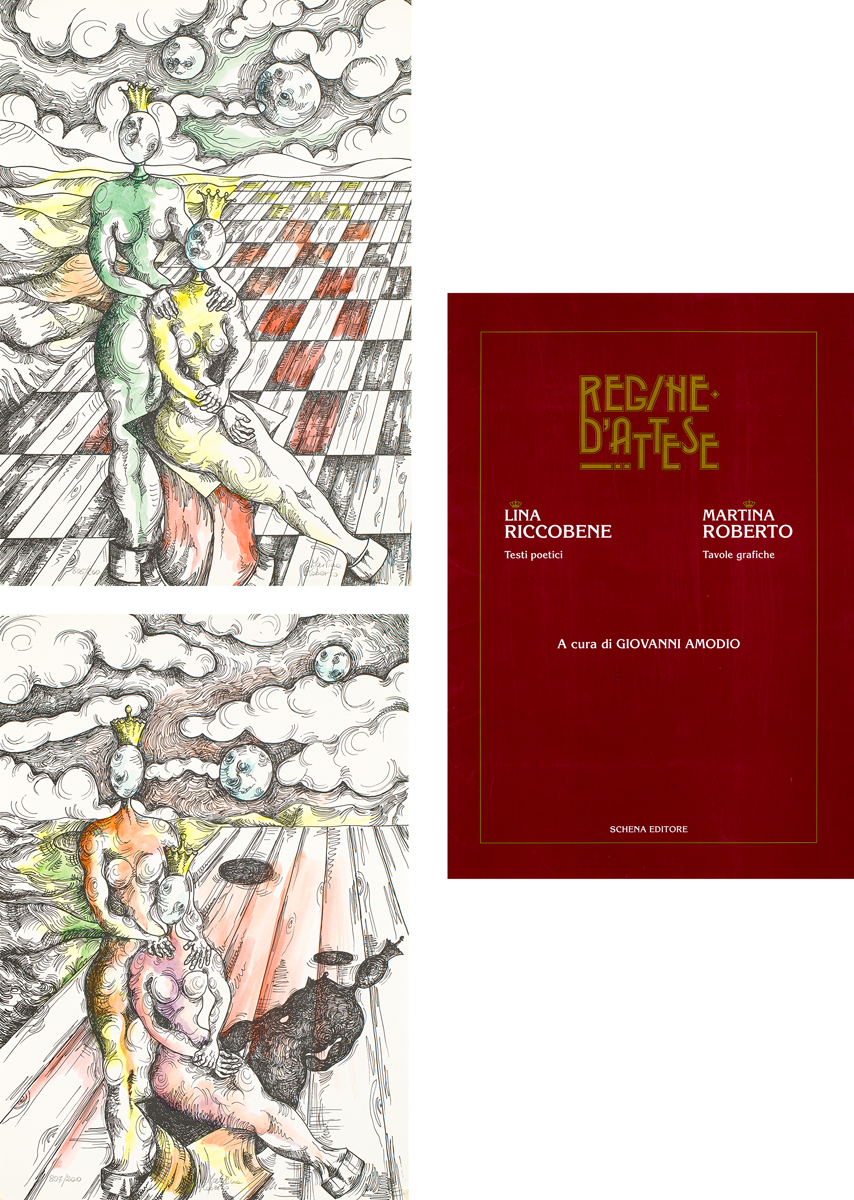 Cartella contenente un testo di presentazione di Giovanni Amodio, 6 poesie di Lina Riccobene e 6 grafiche di Roberto Martina, ciascuna recante firma e numerazione progressiva a matita al fronte
