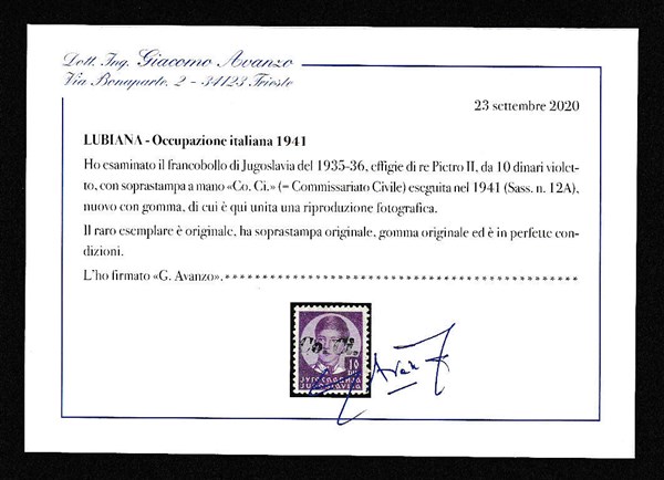LUBIANA Occupazione italiana 1941 10d. violetto soprastampato a mano "Co. Ci."