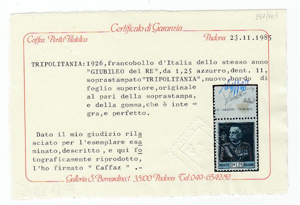 Lot 45 | TRIPOLITANIA 1926 "Giubileo del Re". 1,25 lire azzurro D.11, bordo di foglio su