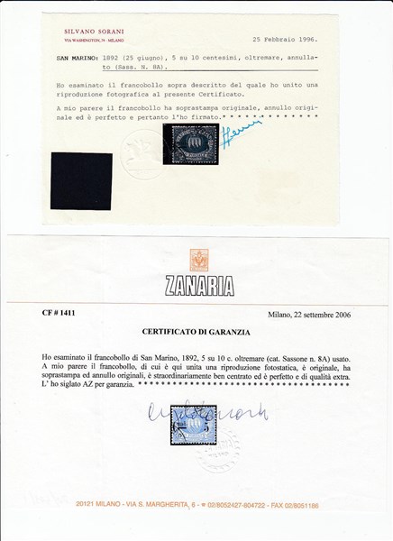 SAN MARINO 1892 "Stemma". 5c./10c. oltremare Cert. S. Sorani, A. Zanaria. Firm