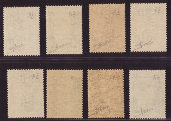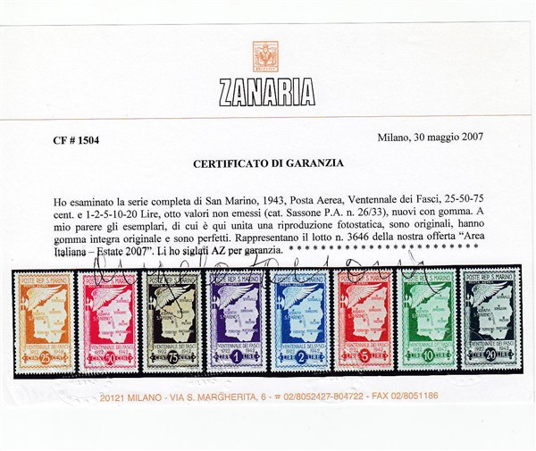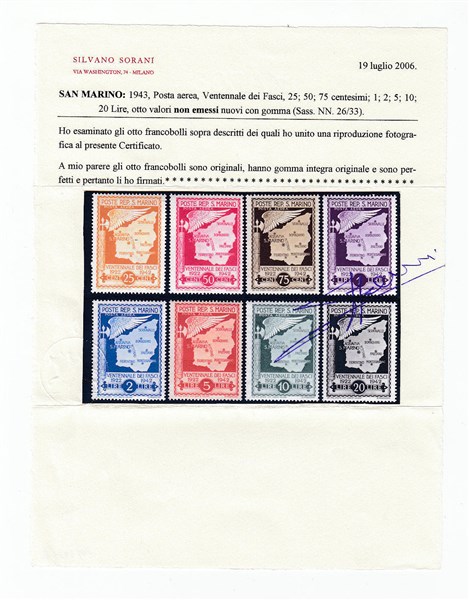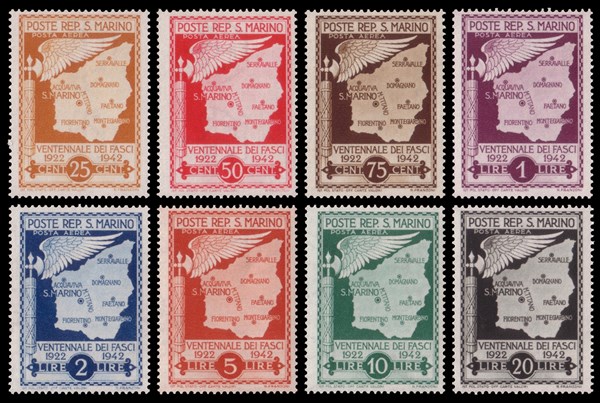 Posta aerea non emessa "Cartina di San Marino con fascio e ala". Serie completa di 8 valori