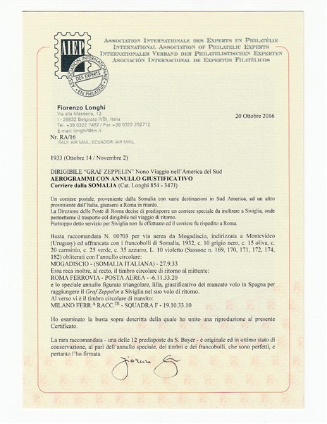 Lot 85 | SOMALIA Zeppelin 1933 (sep. 27) 9. Südamerikafahrt. Cover from Mogadiscio, via