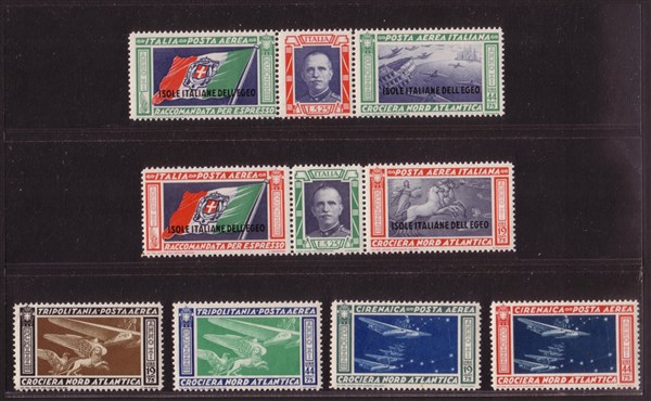 Posta aerea "Crociera del Decennale". Serie completa di 4 valori di Cirenaica e Tripolitania e serie "Trittici" delle Isole Italiane dell'Egeo. Da esaminare