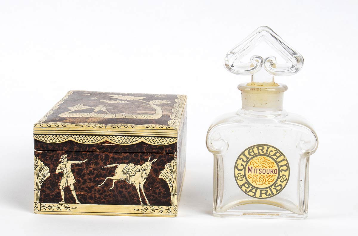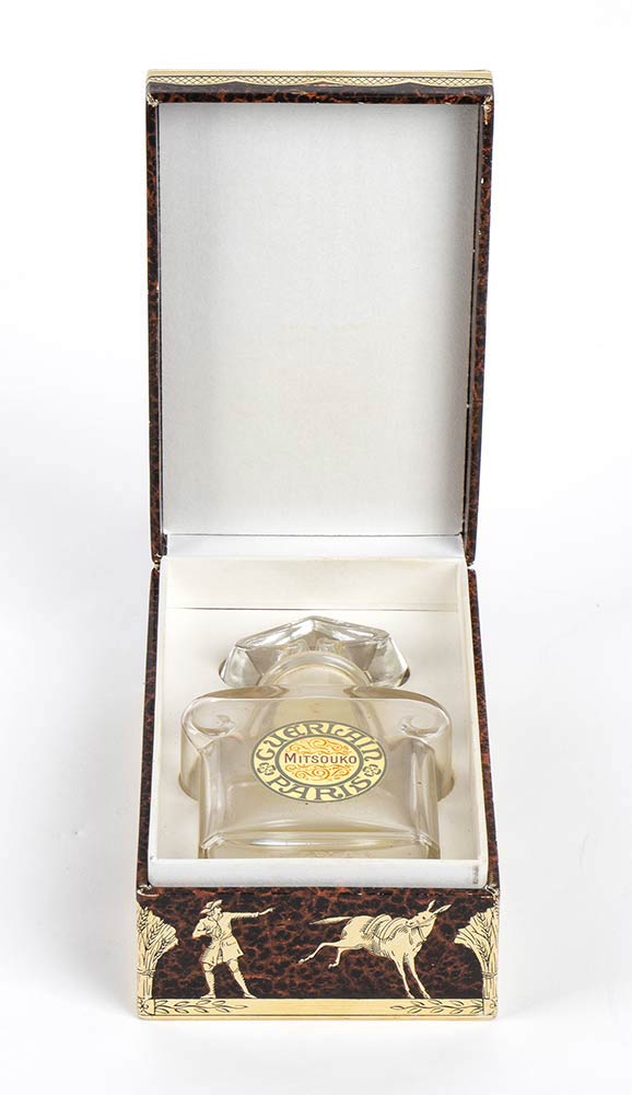 Flacone in cristallo baccarat del profumo Mitsuoko Guerlain, scatola originale. Altezza 11,5 cm