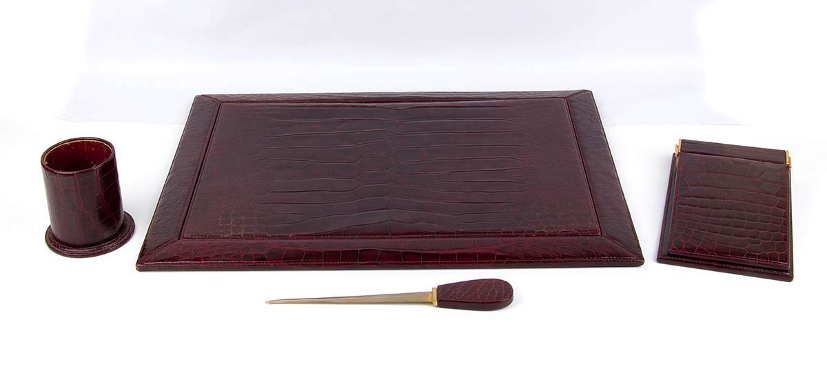 Set da scrittoio ‘Ring’ in pelle di Coccodrillo Marino composto da sottomano, porta blocco, porta penne e apri busta, color bordeaux con chiusure e accessori dorati. Misure sottomano 56,5x42,5 cm; Misure Porta blocco 24,5x14,3 cm; Misure porta penne 10x10,6 cm; Misure apri busta 26,2 cm.