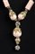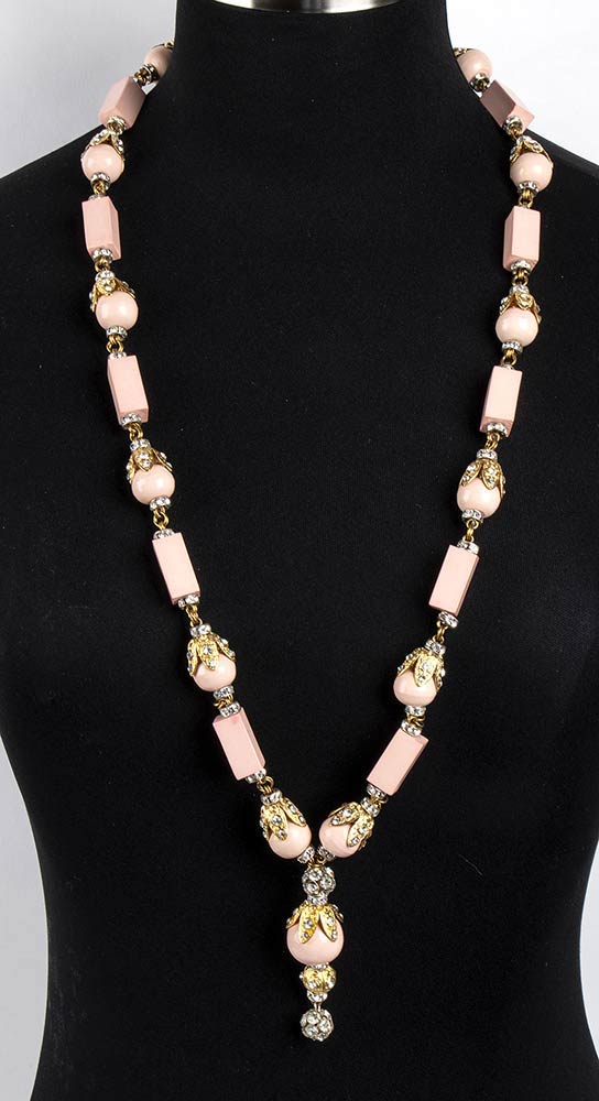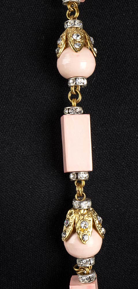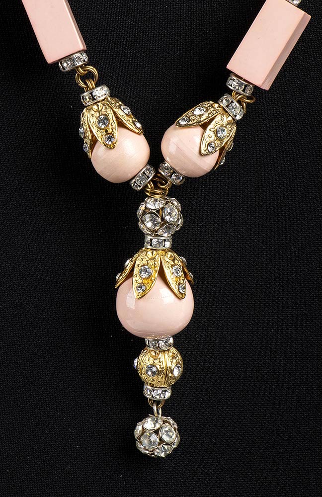 Collana metallo dorato, strass, distanziali in metallo, elementi in resina rosa.