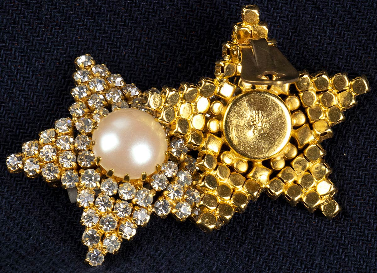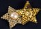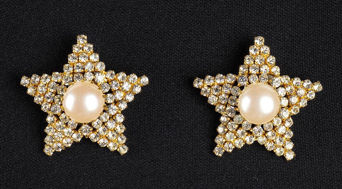 Orecchini a clip a forma di stella, metallo dorato, strass e perle mabé bijoux.