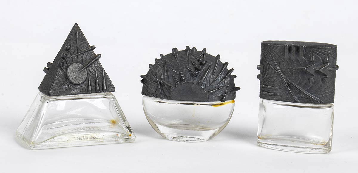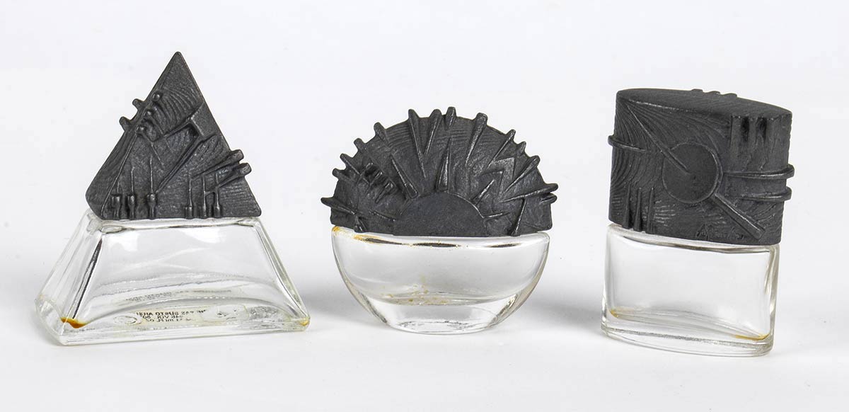 Tre miniature di profumo con tappo scultura dell'artista Arnaldo Pomodoro.