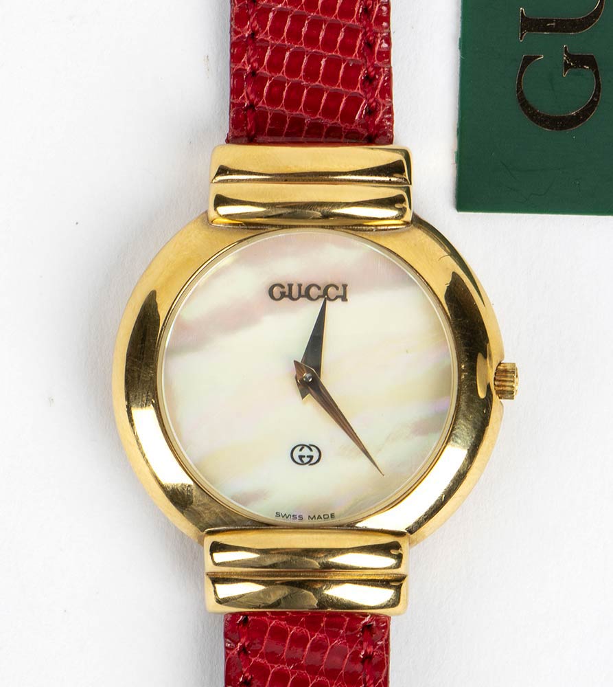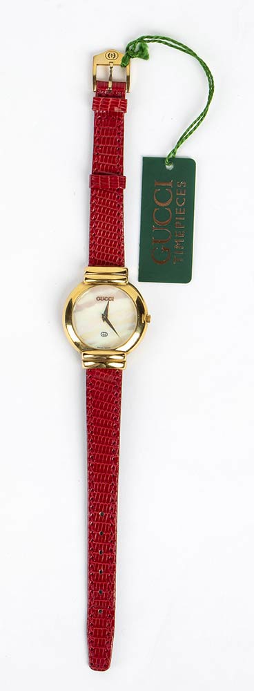 Orologio da donna Gucci 5300L, acciaio placcato oro, movimento al quarzo, quadrante in madreperla, cinturino rosso in pelle.
