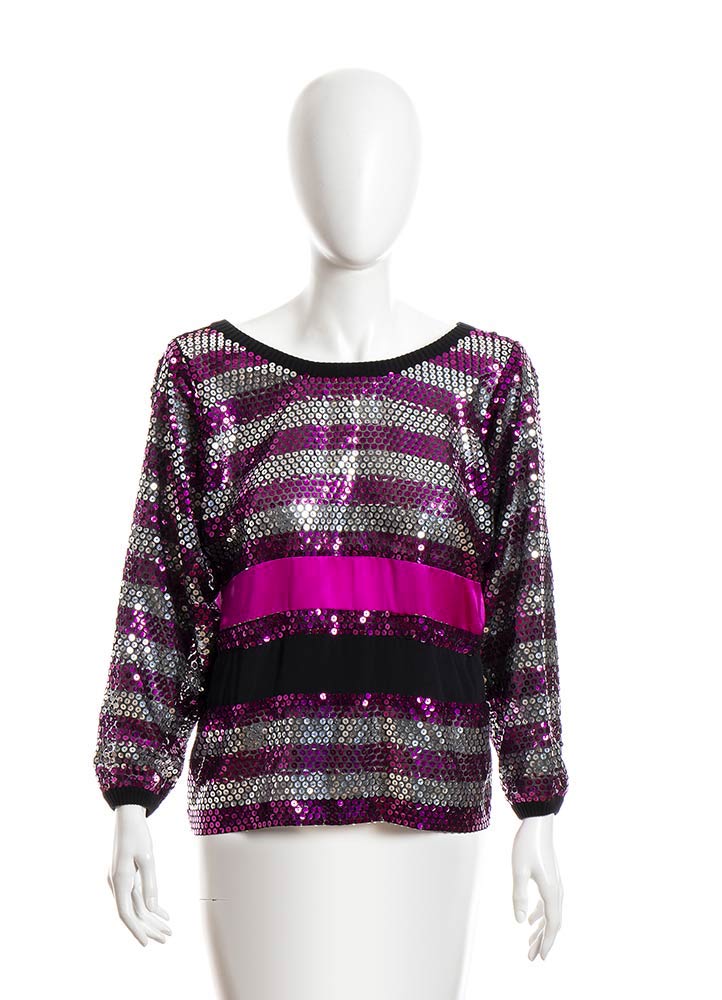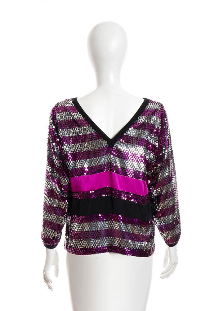 Blusa in paillettes argento e fuchsia e dettagli in raso, Busto 90 cm.