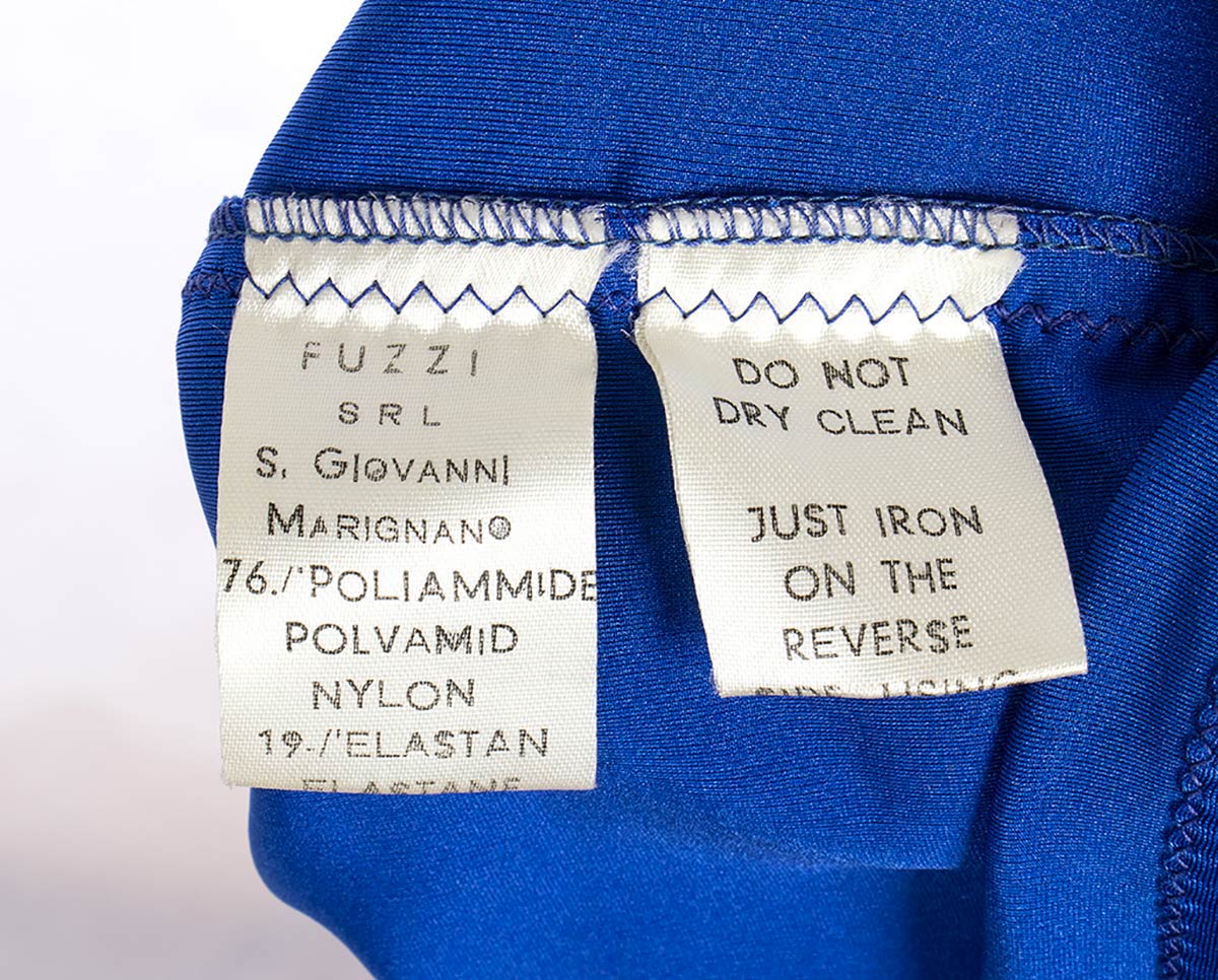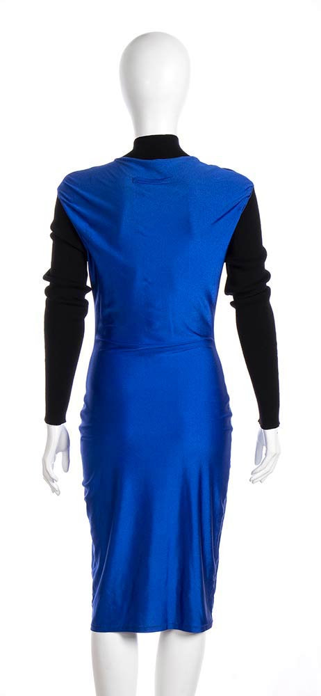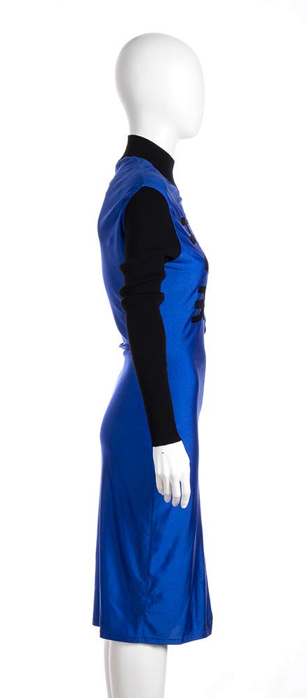 Abito Jean Paul Gaultier (Femme?) - etichetta mancante - ma presente etichetta Fuzzi, in jersey di poliestere blu elettrico e nero