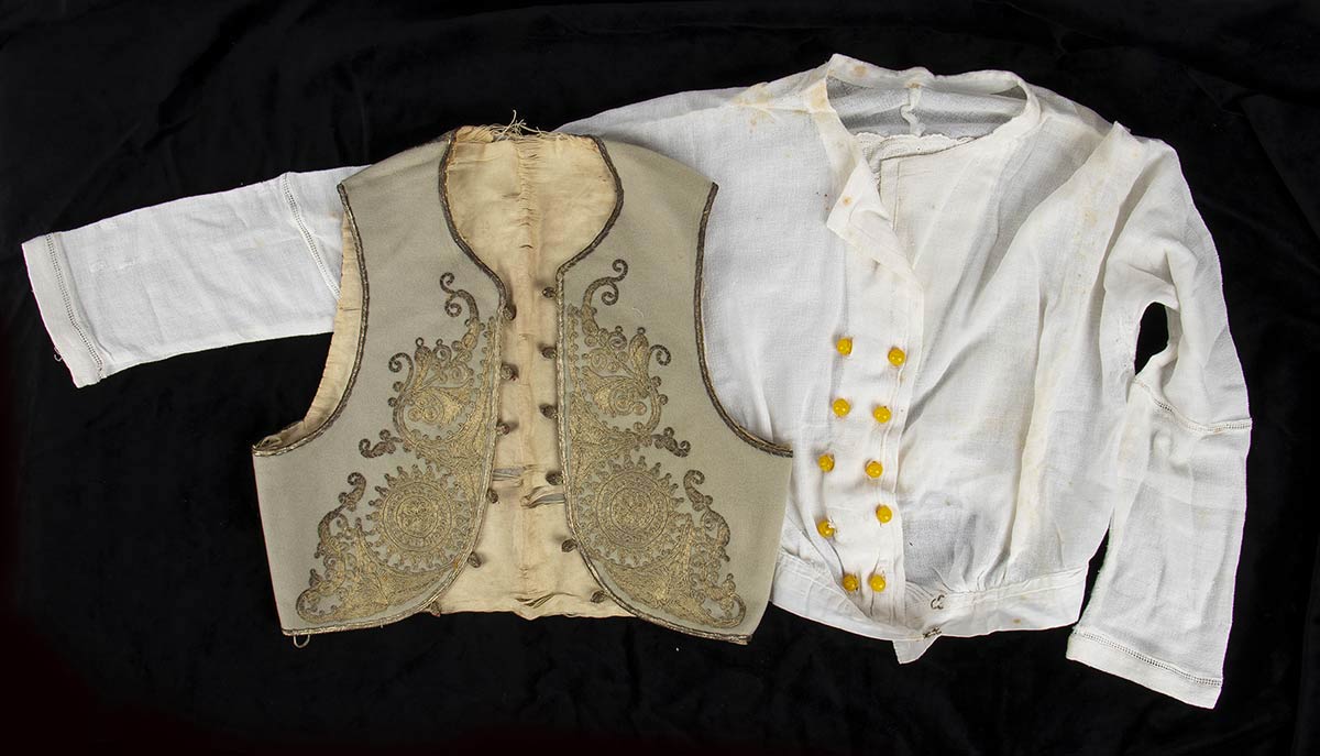 Lotto di 2 articoli: camicia da bambino (3/4 anni) con bottoni in bachelite, Gilet da bambino in panno di lana e applicazione di passamaneria dorata.