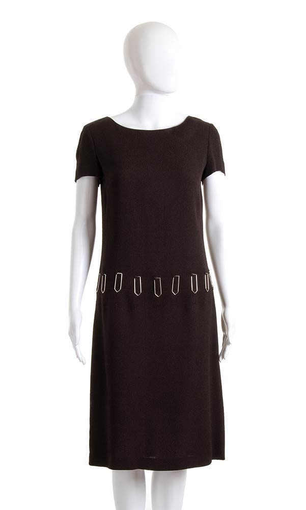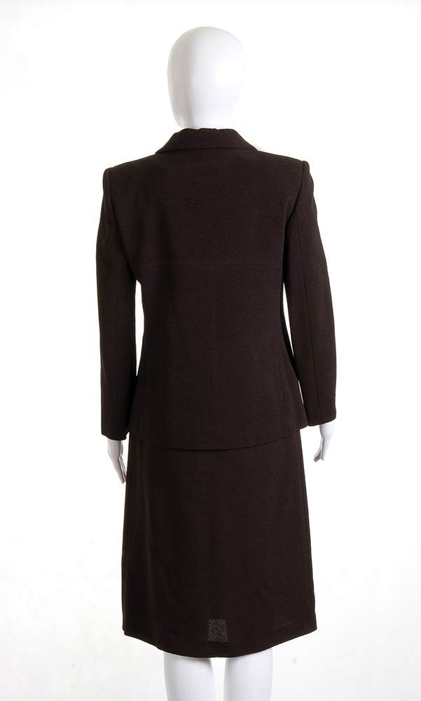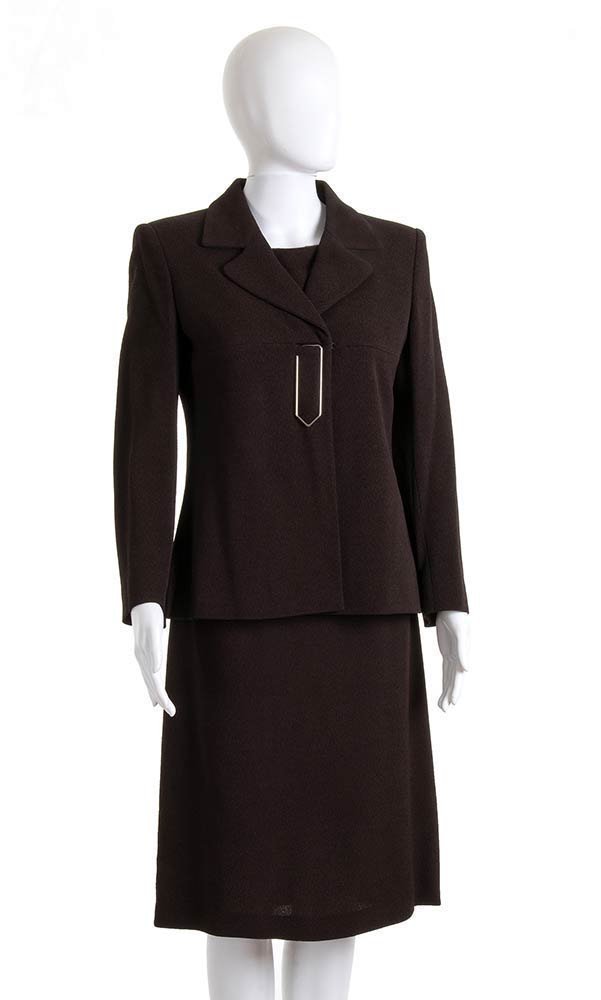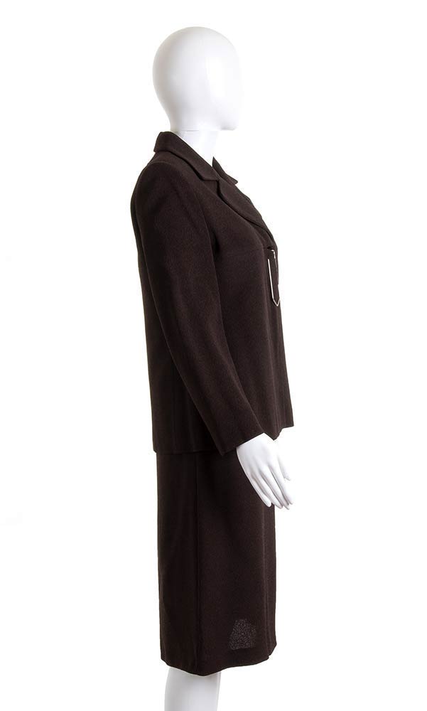 Completo (giacca e abito) in rayon testa di moro, fascia in vita decorata con grandi graffette metalliche, la più grande posizionata sulla giacca Busto 95 cm Vita 80 cm.