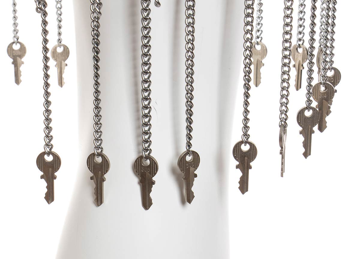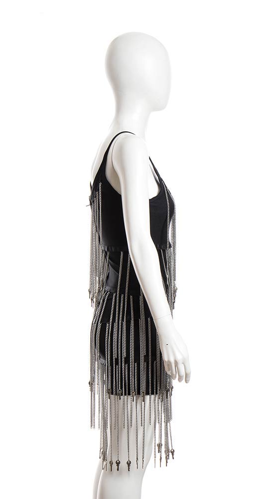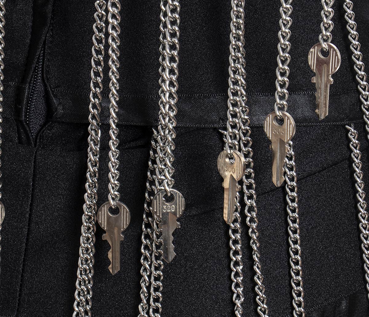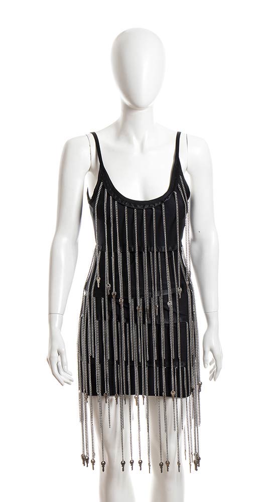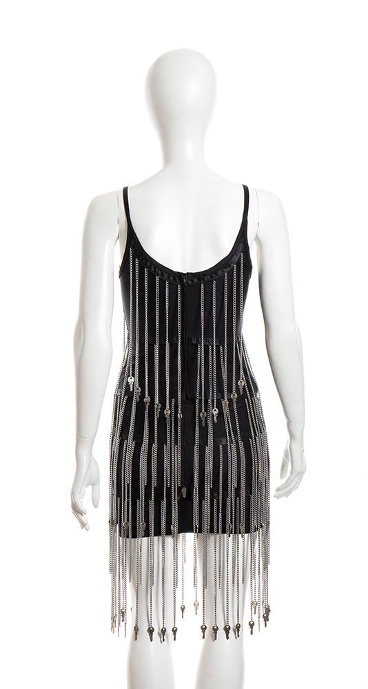 Abito in jersey nero frange create da catene in metallo terminanti con chiavi Busto 85 cm Vita 60 cm Fianchi 85 cm