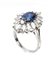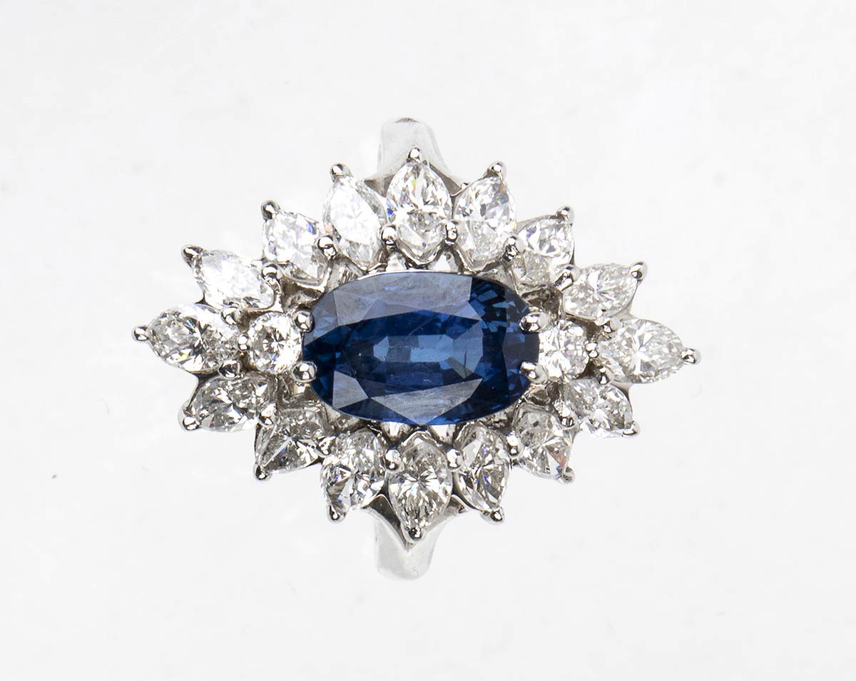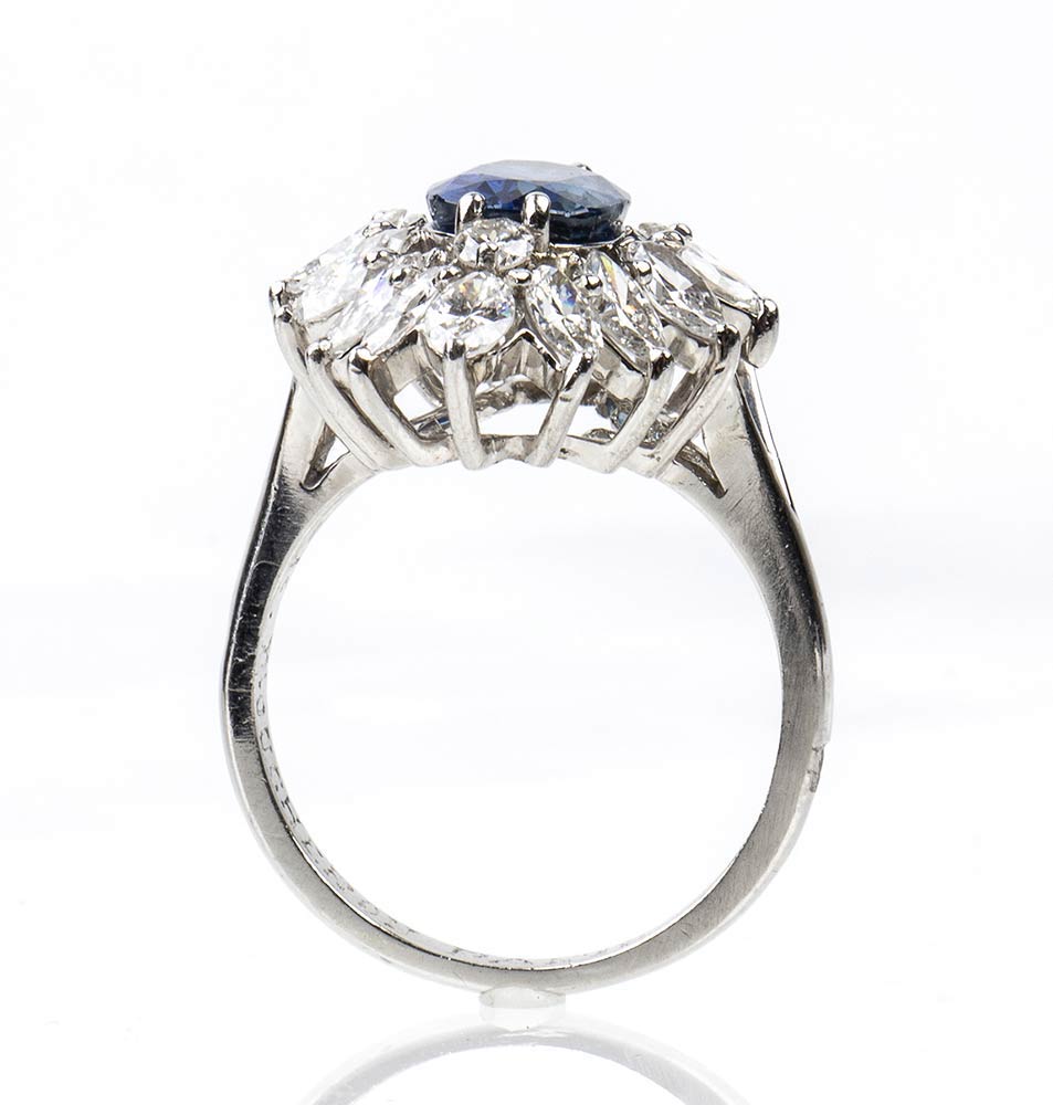 Boucheron, Anello il platino con al centro uno zaffiro per 2,90 ct circa (presenta trattamento termico), diamanti taglio navette per circa 2,5 ct, gr 9. Il lotto è corredato di certificato IGN n. 22485