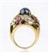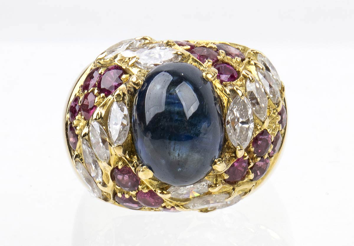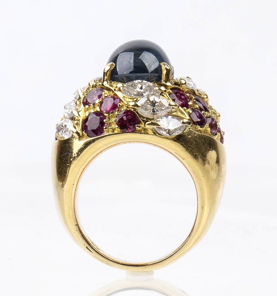 Boucheron, anello in oro giallo 18kt, gr 21, con zaffiro cabochon centrale per circa 5 ct, diamanti taglio navette per circa 2 ct e rubini