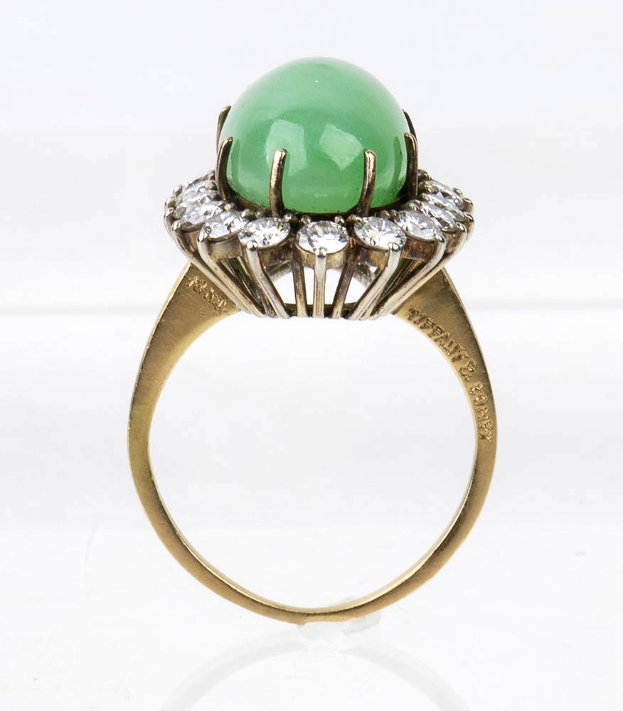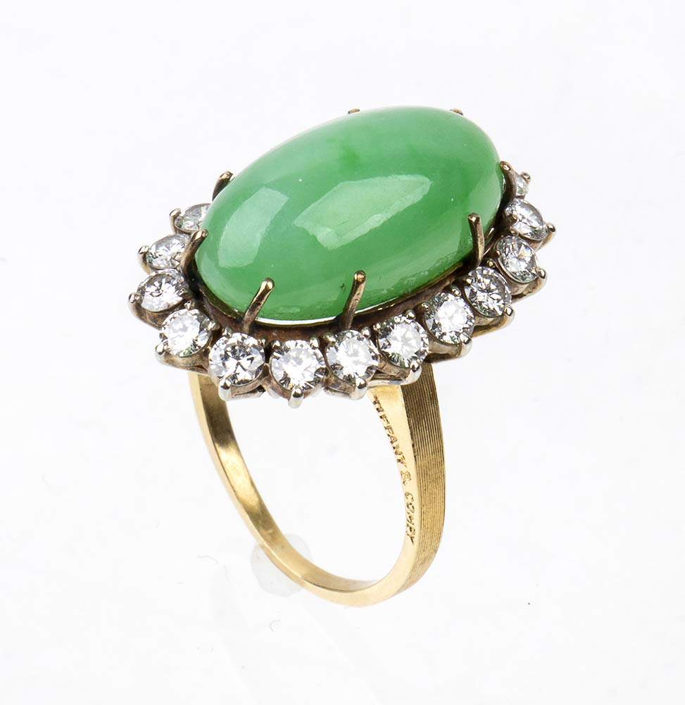 Tiffany, anello in oro giallo 18kt, gr 8.60, con diamanti taglio brillante per circa 1,50 ct e giada centrale