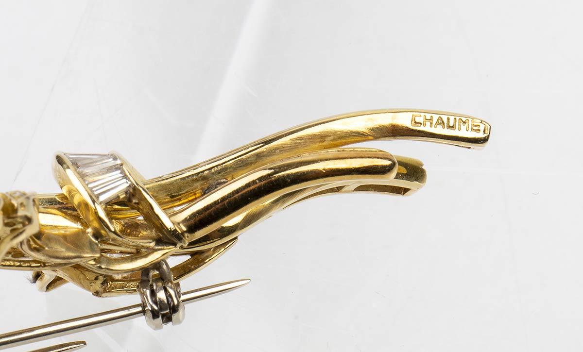 Chaumette, spilla in oro giallo 18kt, peso gr 44,60, diamanti taglio brillante per circa 10 ct