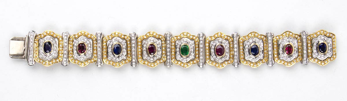 Chaumette, bracciale in oro giallo e bianco 18kt con diamanti taglio brillante per circa 6 ct e pietre di colore taglio ovale per circa 15 ct. Peso gr 74,50