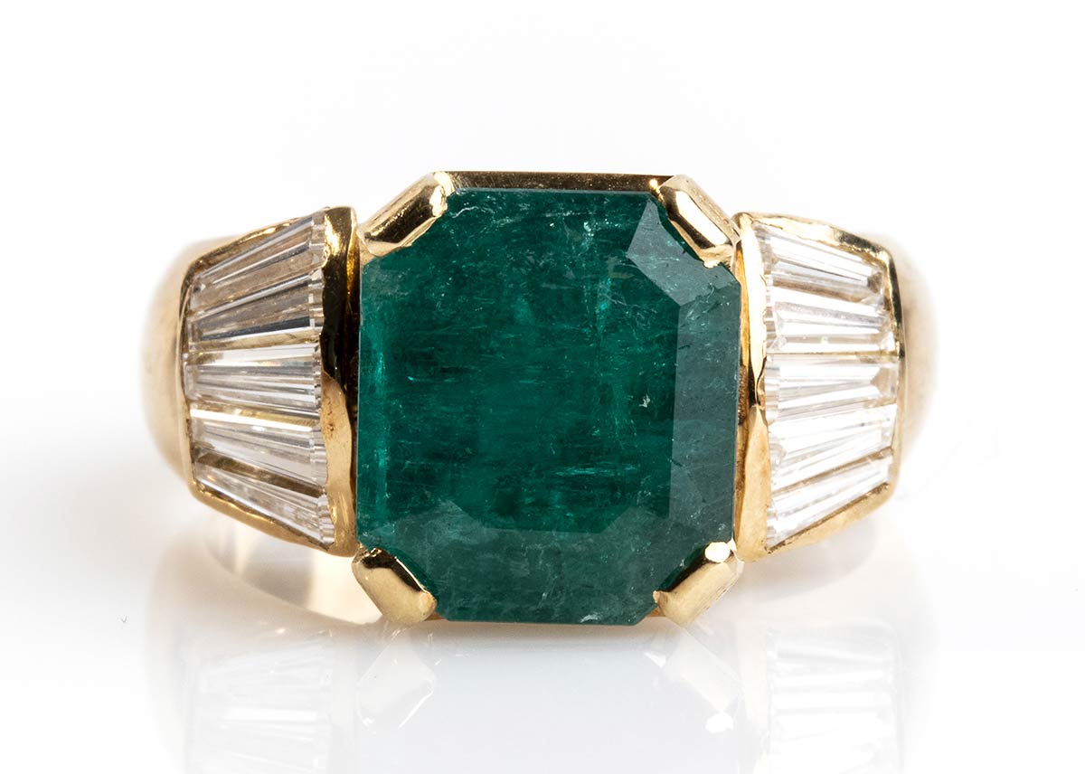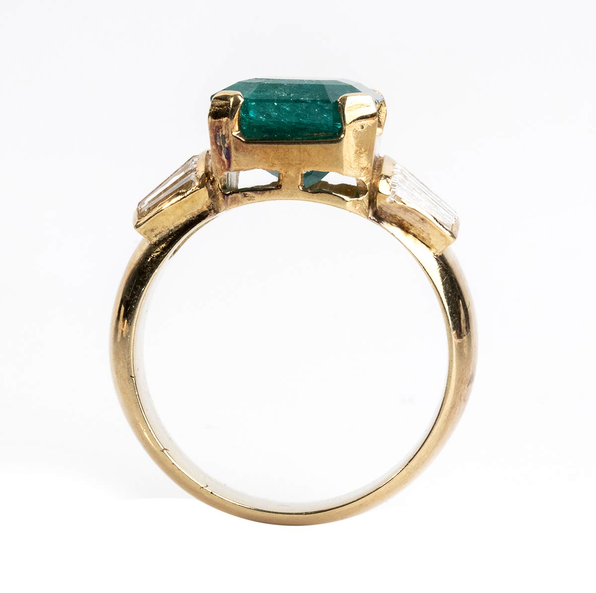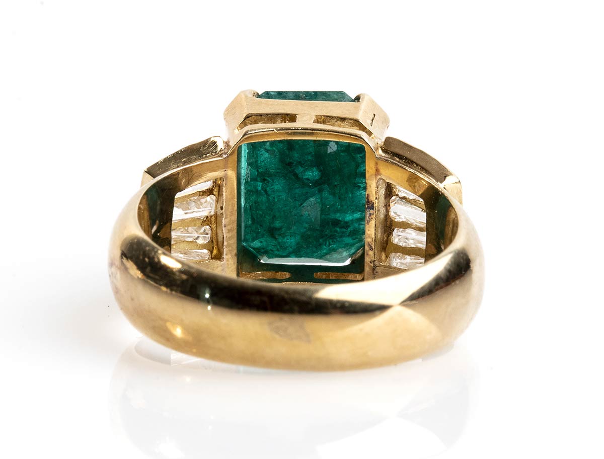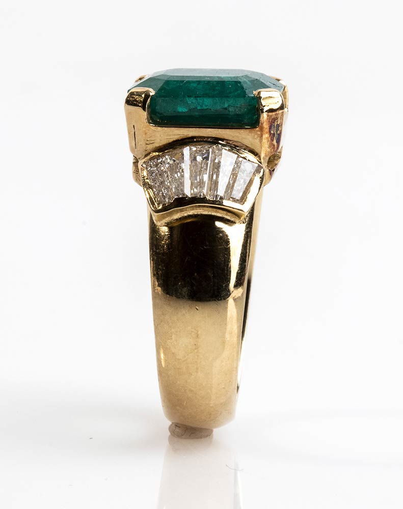 anello in oro 18 kt con smeraldo centrle circa 4 carati e diamanti laterali taglio tapered baguette circa 1,05 carati peso 7,90 gr