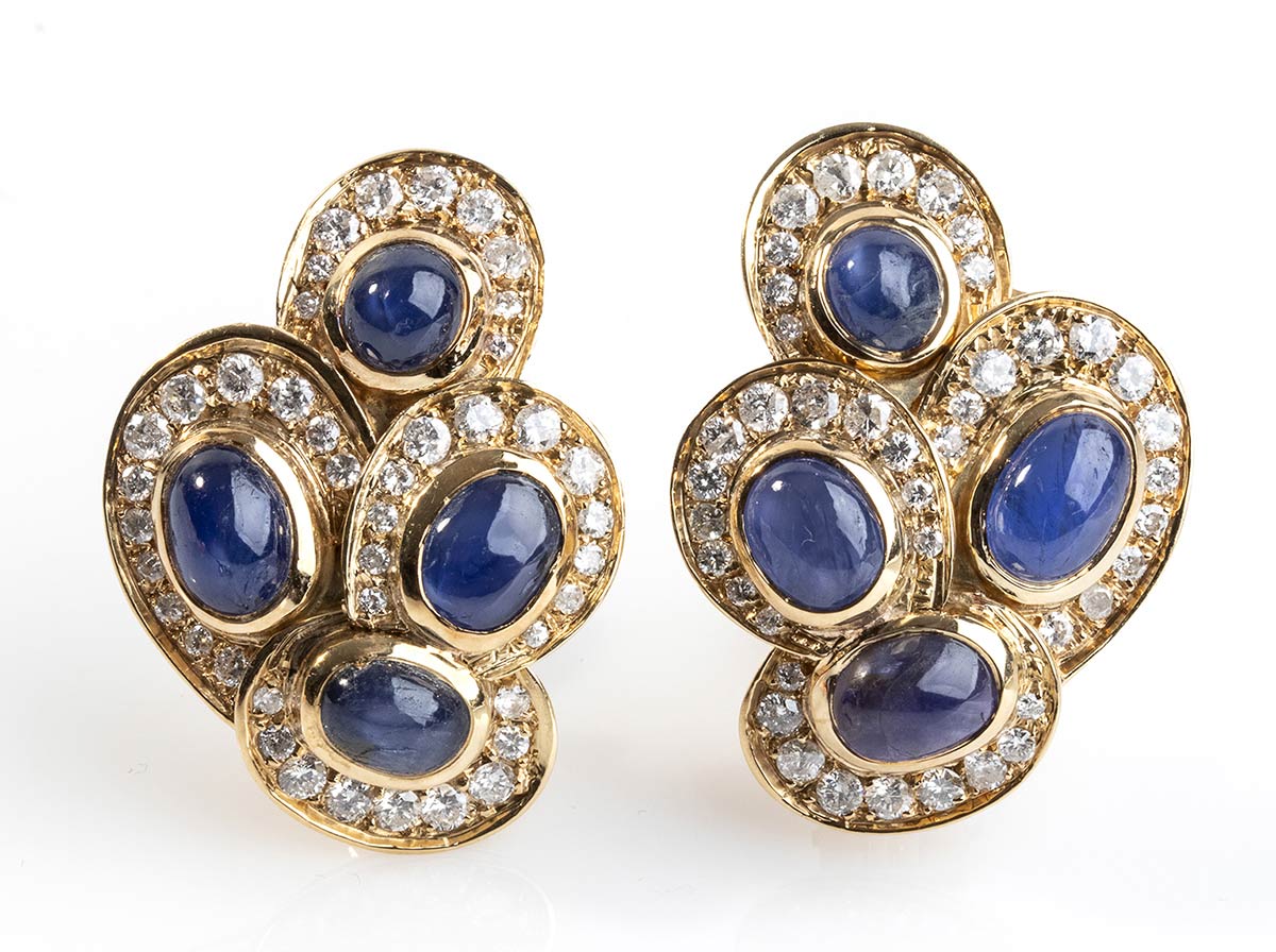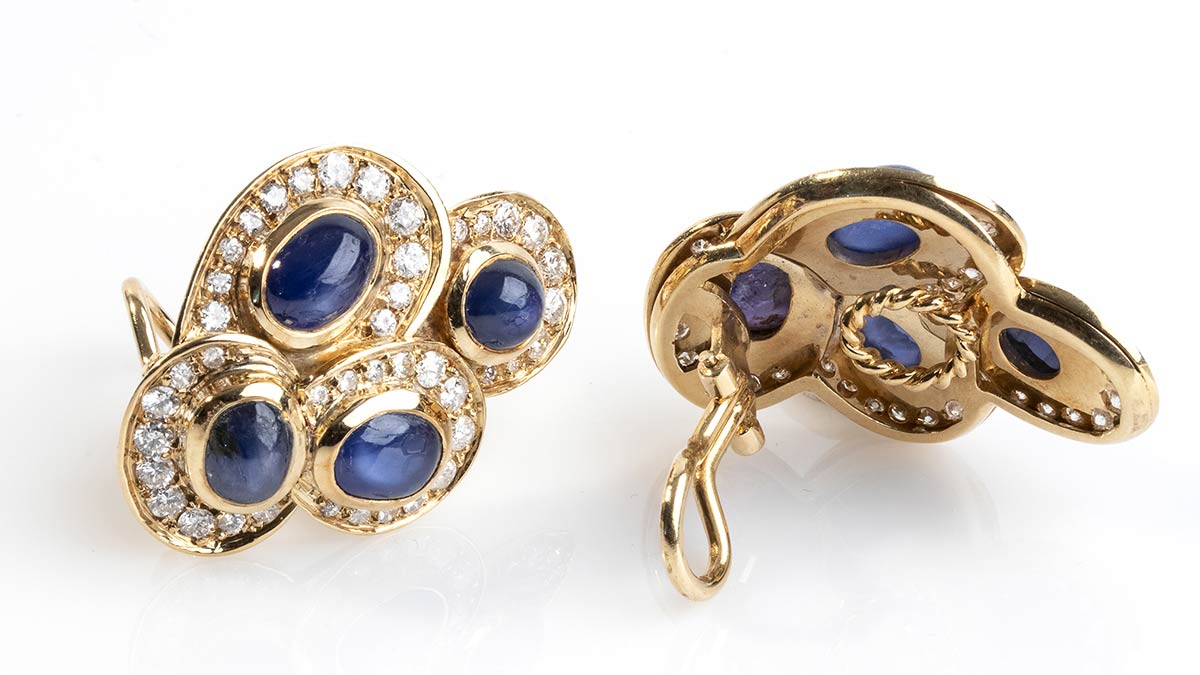 orecchini in oro 18 kt con diamant itaglio brillanti ct circa 2,00 e zaffiri cabochon ct circa 3,2 peso 24,12 gr
