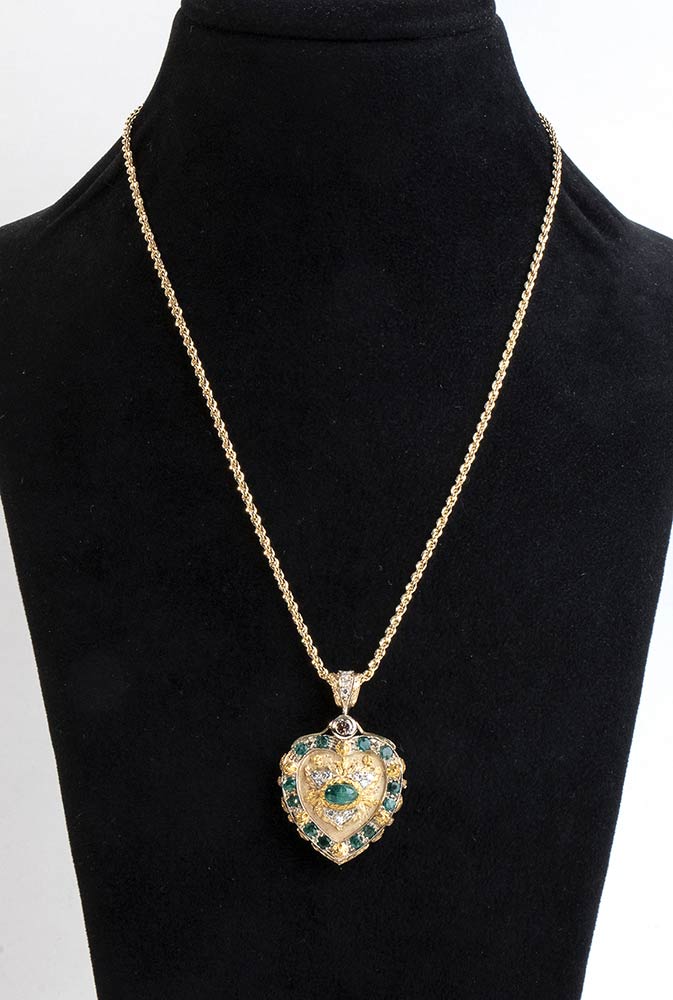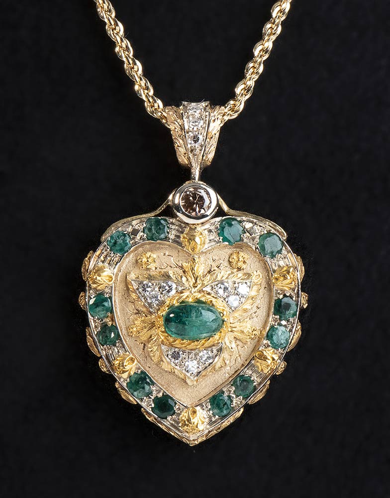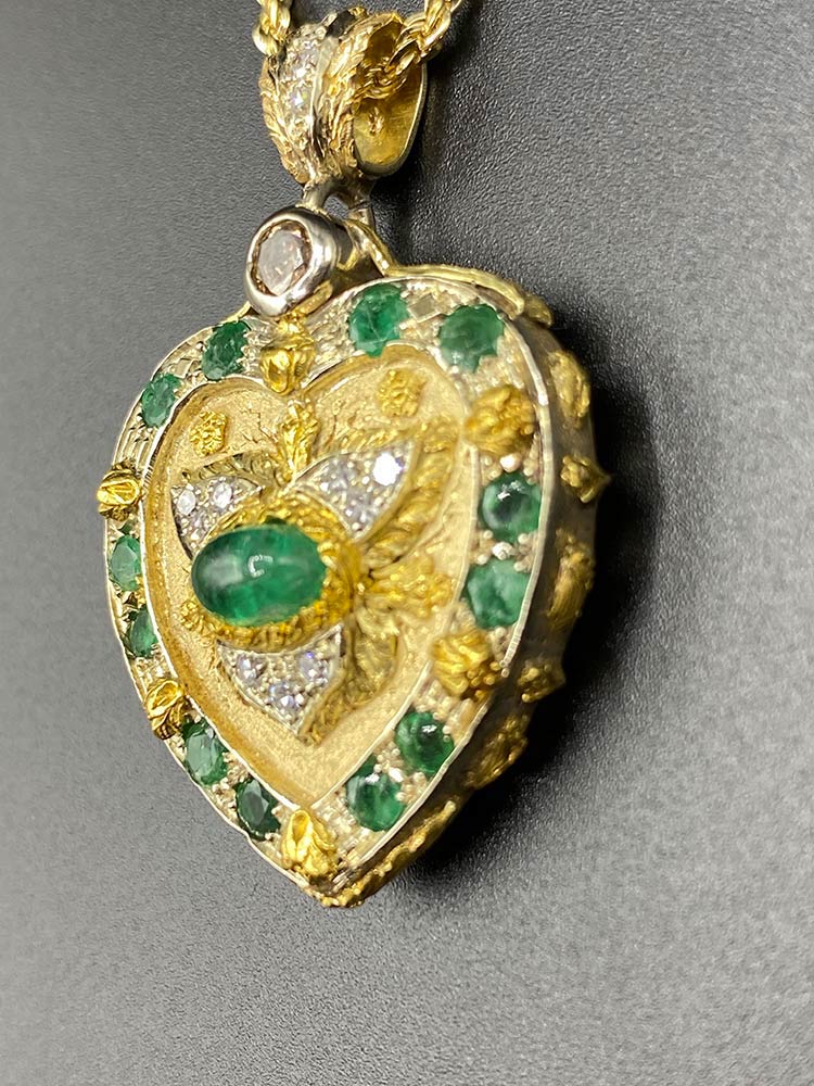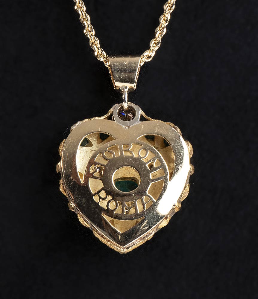 collana e ciondolo in oro 18 kt con smeraldo centrale cabochon e smeraldi di contorno taglio rotondo, Diamante taglio brillante ct circa 1,15 e diamante brown taglio brillante ct circa 0,15 diamanti taglio brillante ct circa 0,25 riporta incisione MORONI Roma peso 24,60 gr