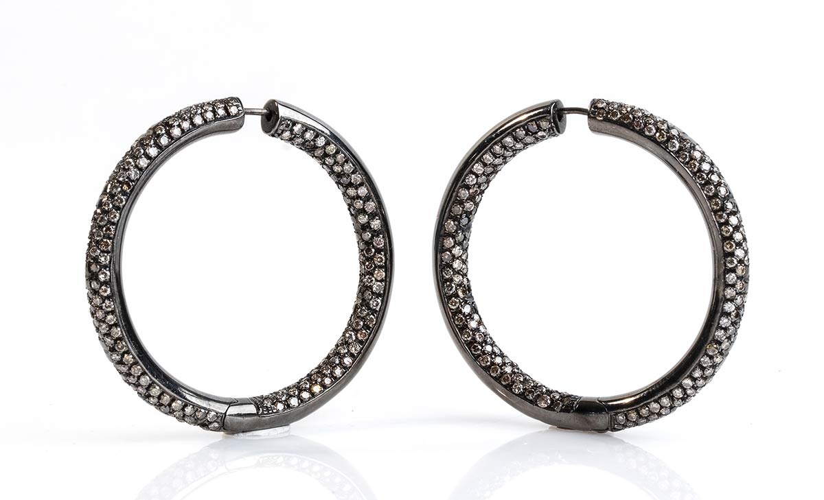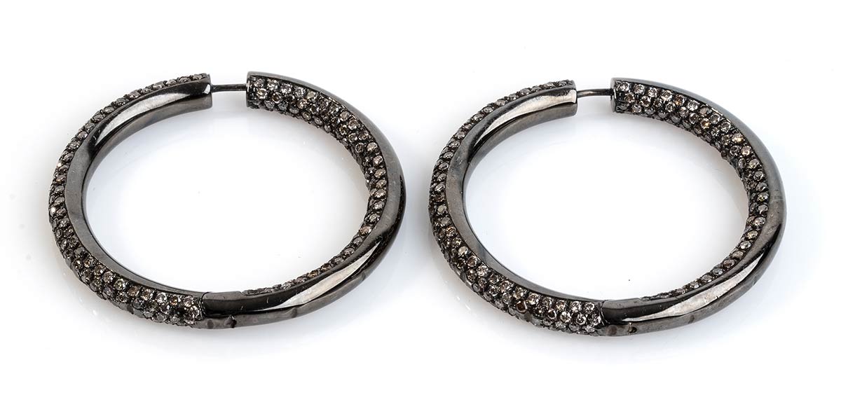 orecchini a cerhio in oro 18 kt brunito e pavè di diamanti brown taglio brillante ct circa 5,5 peso 30,48 gr