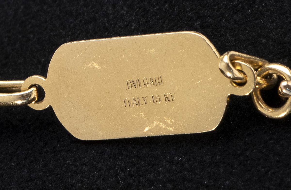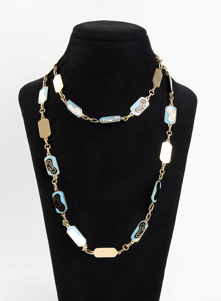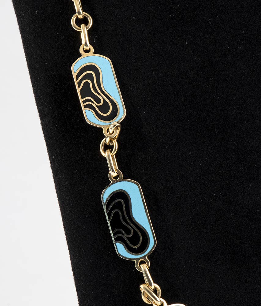 Collana Vintage firmata BVLGARI, in oro giallo 18Kt, decorata con smalti di alta qualità, motivo fantasia, azzurri bianchi e blù.Peso 76,65 gr, lunghezza 90 cm. Chiusura a gancio.