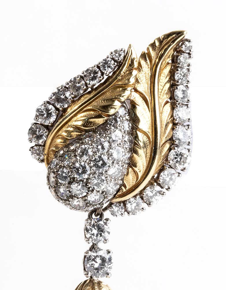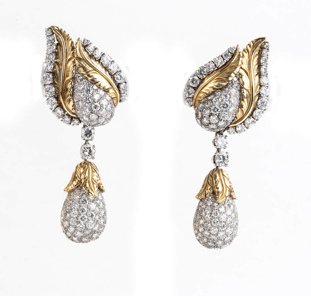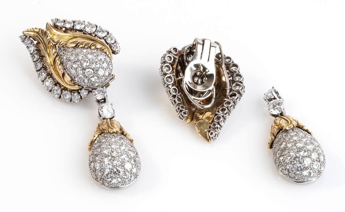 Importanti orecchini Made in Italy, realizzati a mano da artigiani orafi. Costruiti in oro giallo la parte lavorata a foglia e oro bianco la parte dell'incassatura a pavè di diamanti taglio Amsterdam di altissima qualità, colore E/F purezza IF/VVs1, per un totale di cica 10 carati. Gli orecchini possono essere facilmente separati, come si vede dalle foto.