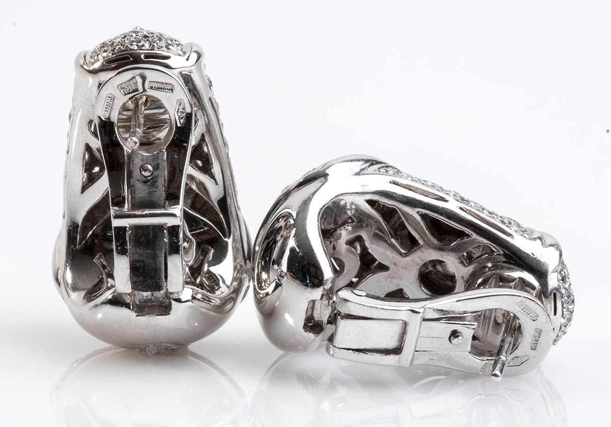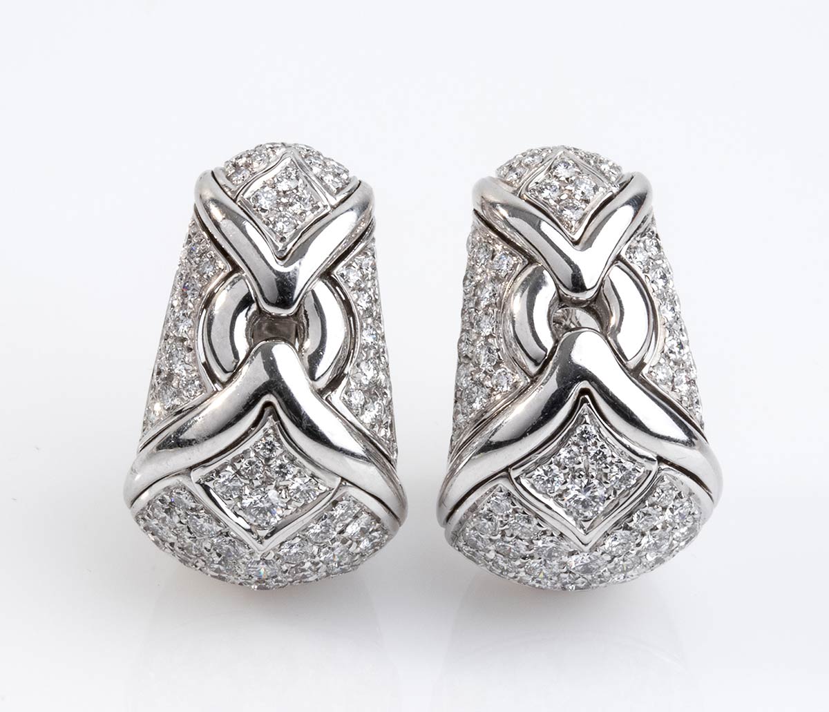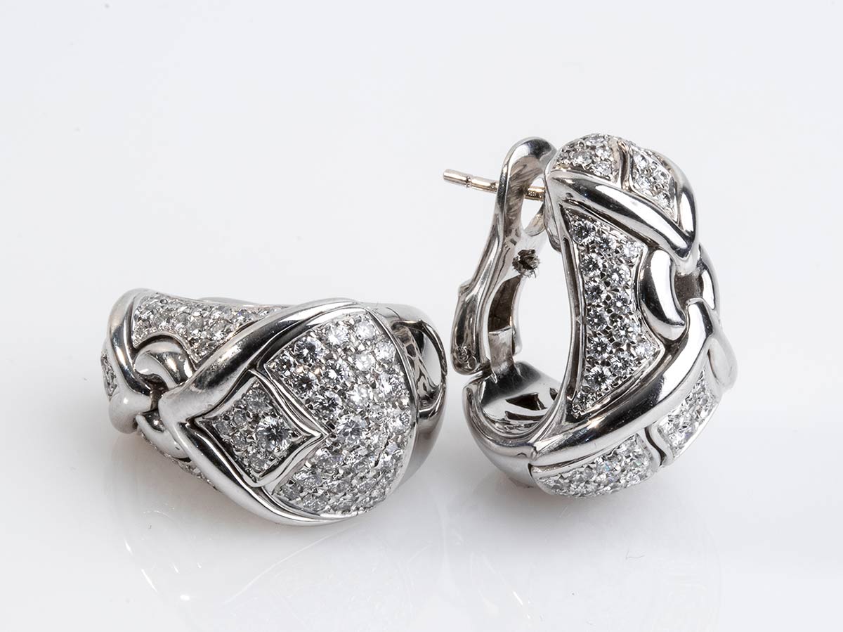 Orecchini BVLGARI linea Parentesi, in oro bianco 18 Kt, 23,24 Gr, con pavè di diamanti naturali taglio Amsterdam, circa 3 carati, colore F/G, purezza VVs1.