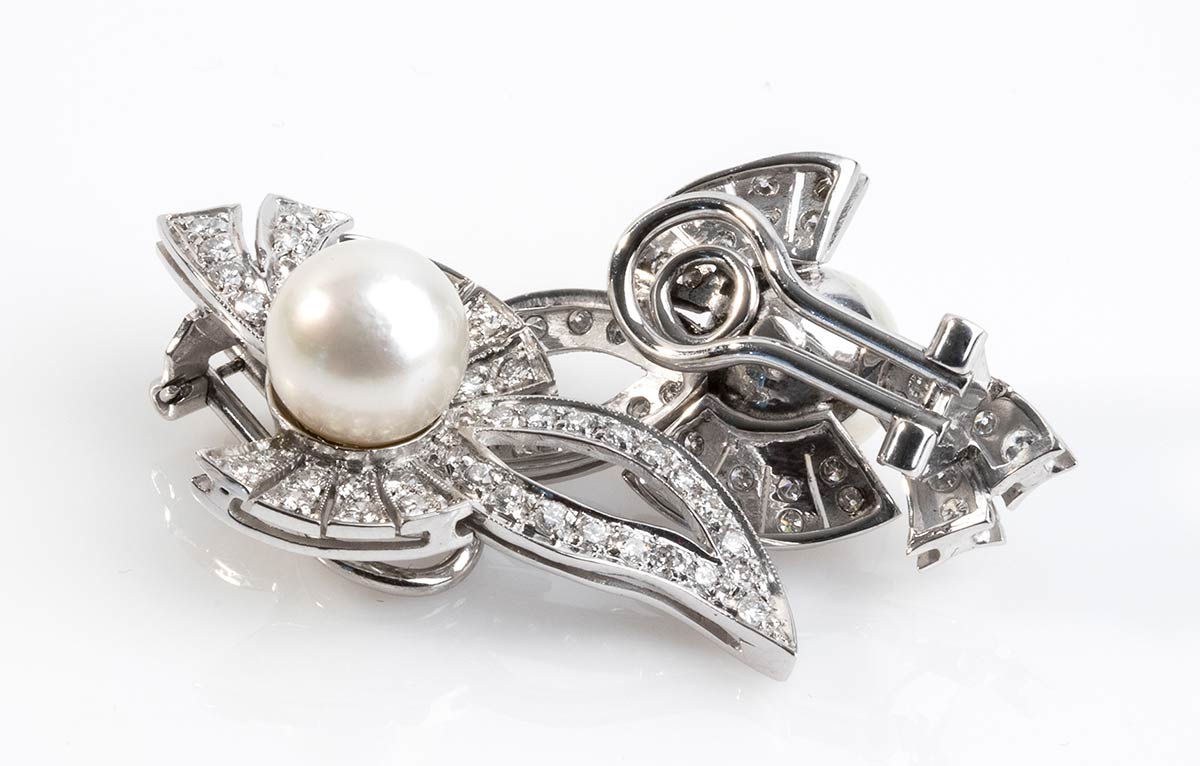 in oro bianco 18 Kt, peso 14,60 Gr. Particolare forma fantasia, con incastonati diamanti taglio rotondo, carati circa 2 colore F/G purezza VVs/Vs. e 2 perle coltivate 9,8 mm.