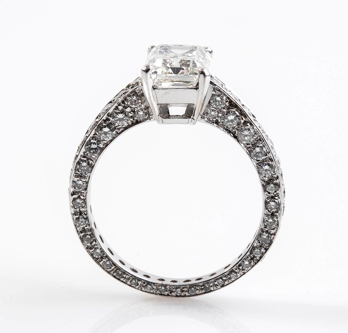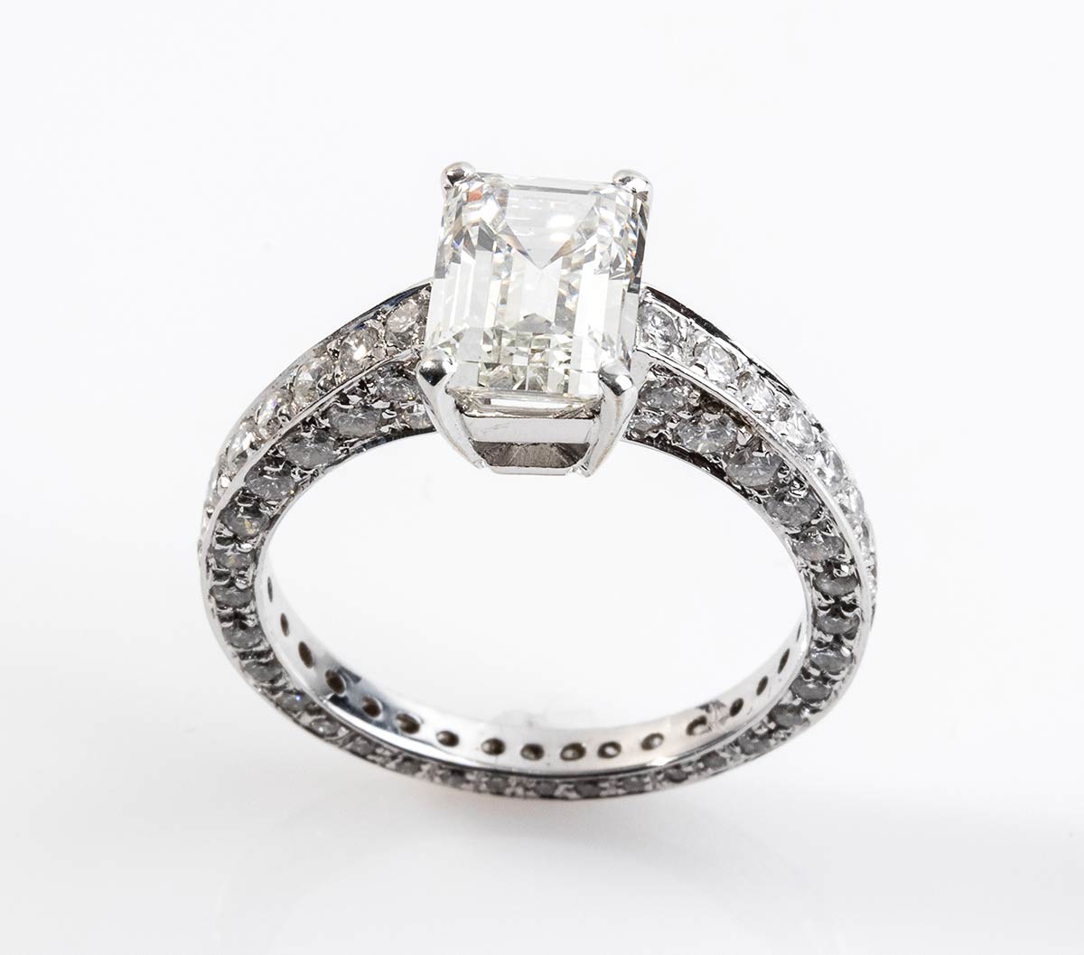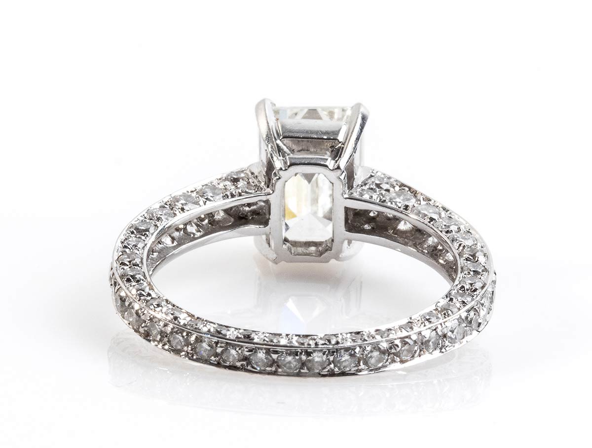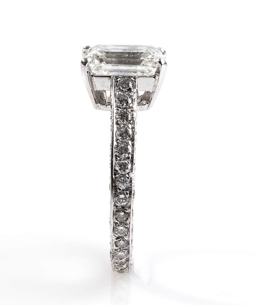 Importante anello solitario in oro bianco 18 Kt, montatura con contorno a pavè di diamanti taglio Brillante, circa 2 carati, e Diamante centrale Taglio smeraldo di 2,41 carati, colre J purezza Vs1. Corredato di certificato IGI Roma.