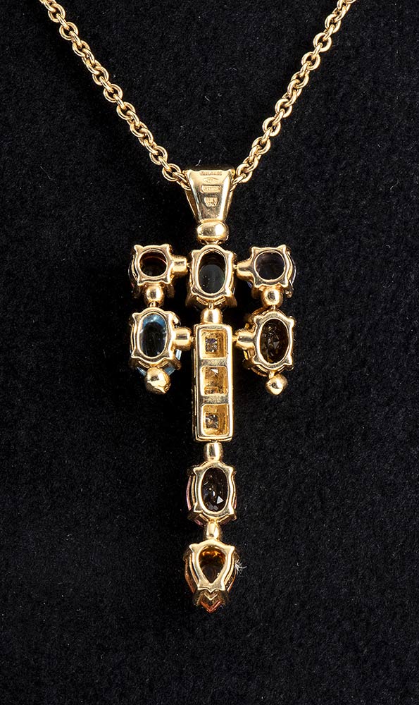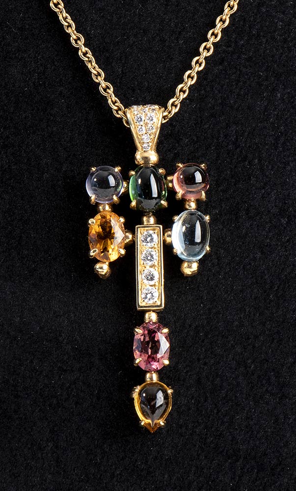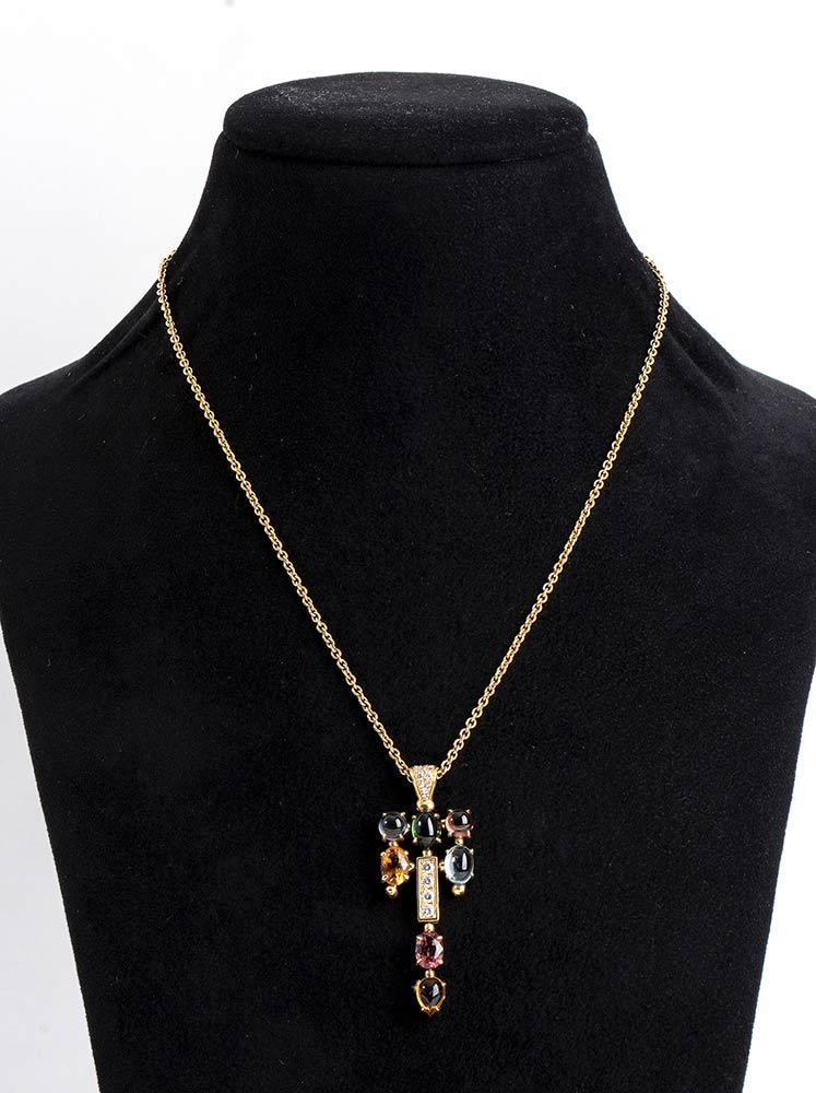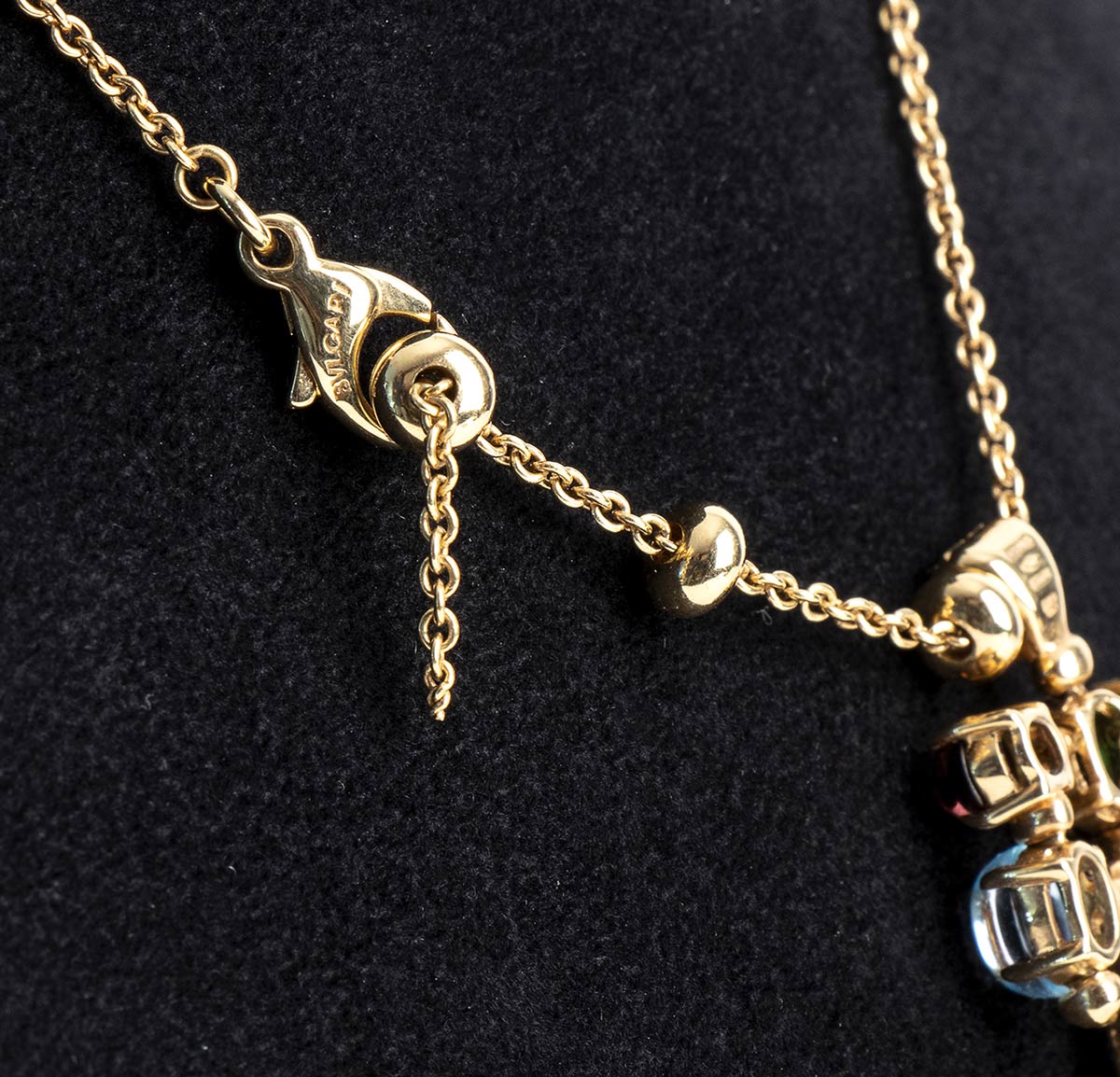 Collana BVLGARI collezzione ALLEGRA in oro giallo 18 KT, peso Gr 15,24 con pietre colorate taglio cbochon , quarzo cirtino, peridoto, tormaline e diamanti per Carati 0.40, Colore E, Purezza VVS1. Lunghezza 40 cm con regolatore.a palline e moschettone con firma Bulgari.