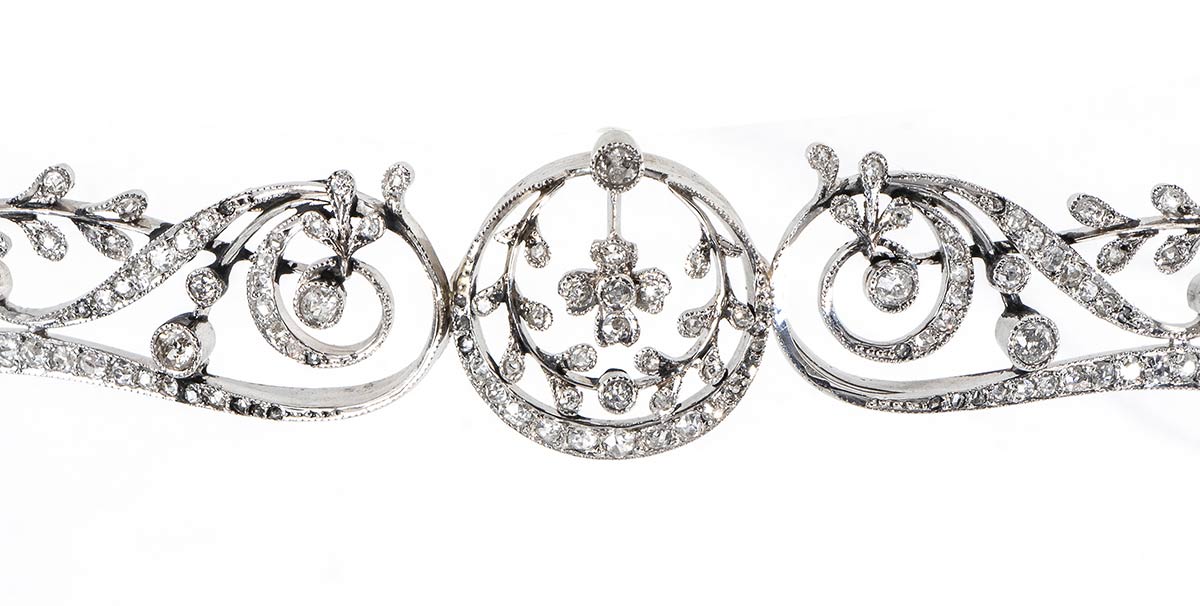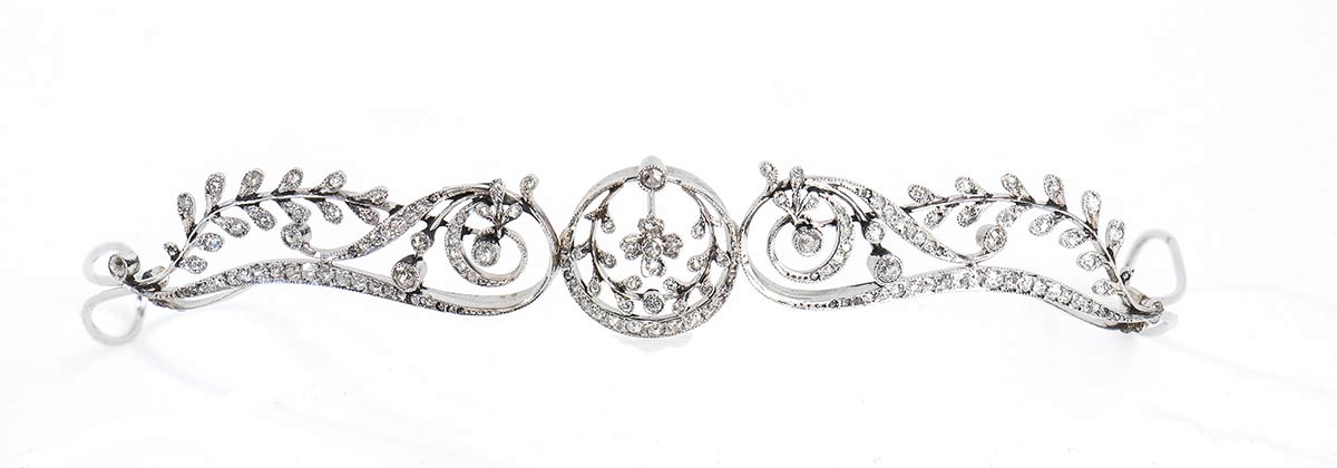 DIADEMA in Platino 950, peso 15,5 Gr. Abilmente costriuto da artigiani orafi italiani, vi sono incastonati diamanti taglio antico per un totasle di circa 3 carati.
