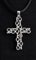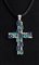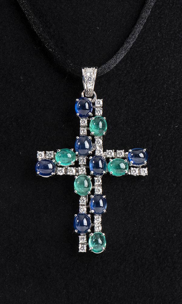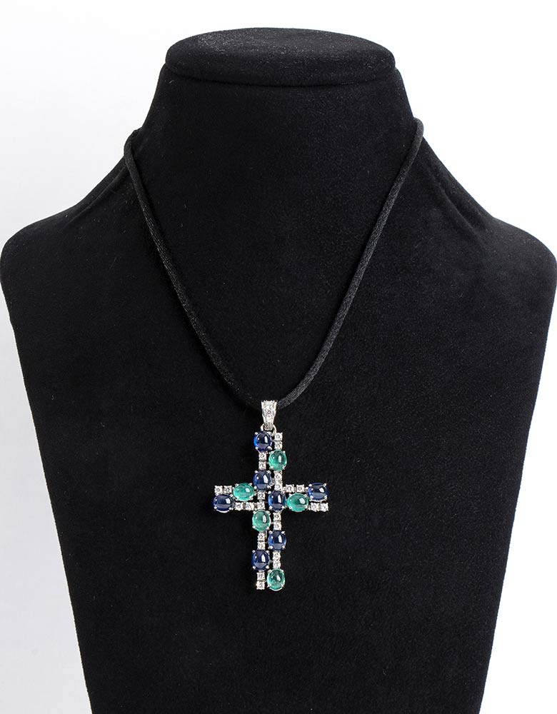Pendente a forma di croce in oro bianco 18 Kt, peso 12,5 Gr, con incastonati cabochon di smeraldi e zaffiri di ottima qualità e colore, per circa 5 carati, e diamanti naturali taglio amsterdam per carati 1,20. G/H color, purezza VVs/Vs.