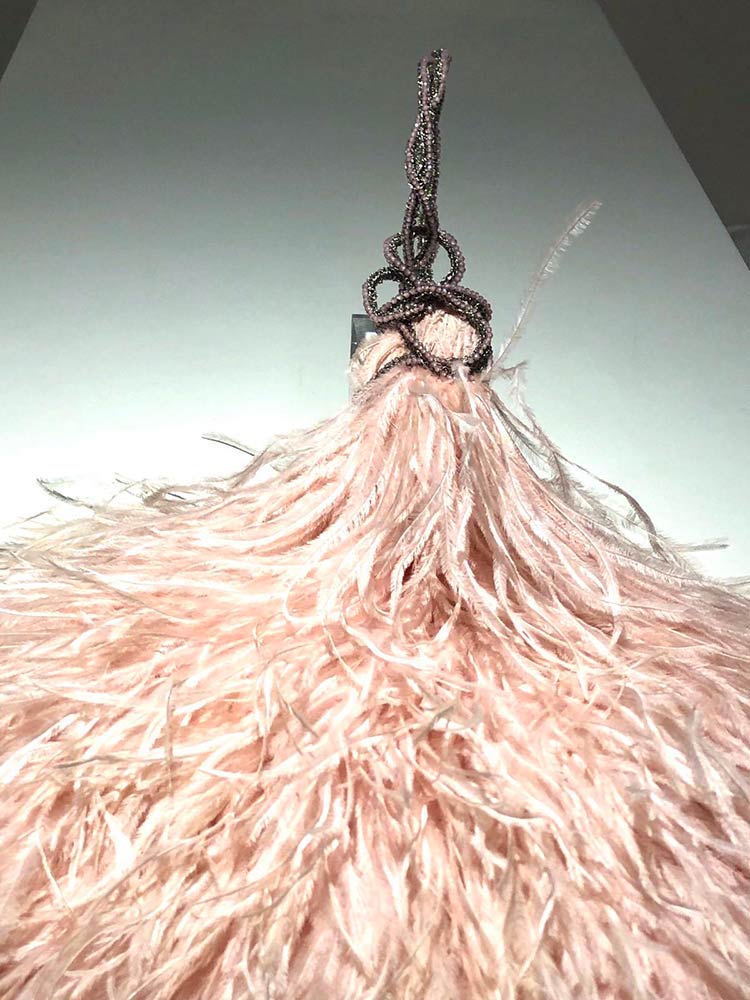 BORSA IN PIUME DI STRUZZO ROSA CON CHIUSURA-BRACCIALE IN FILIGRANA DI FERRO E ZIRCONI ROSA