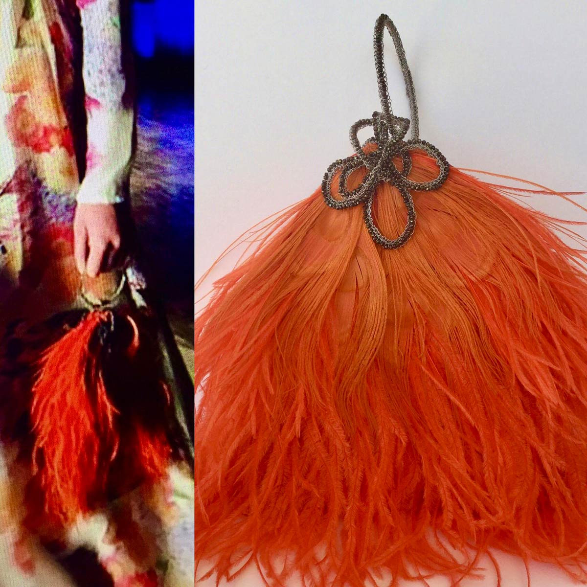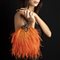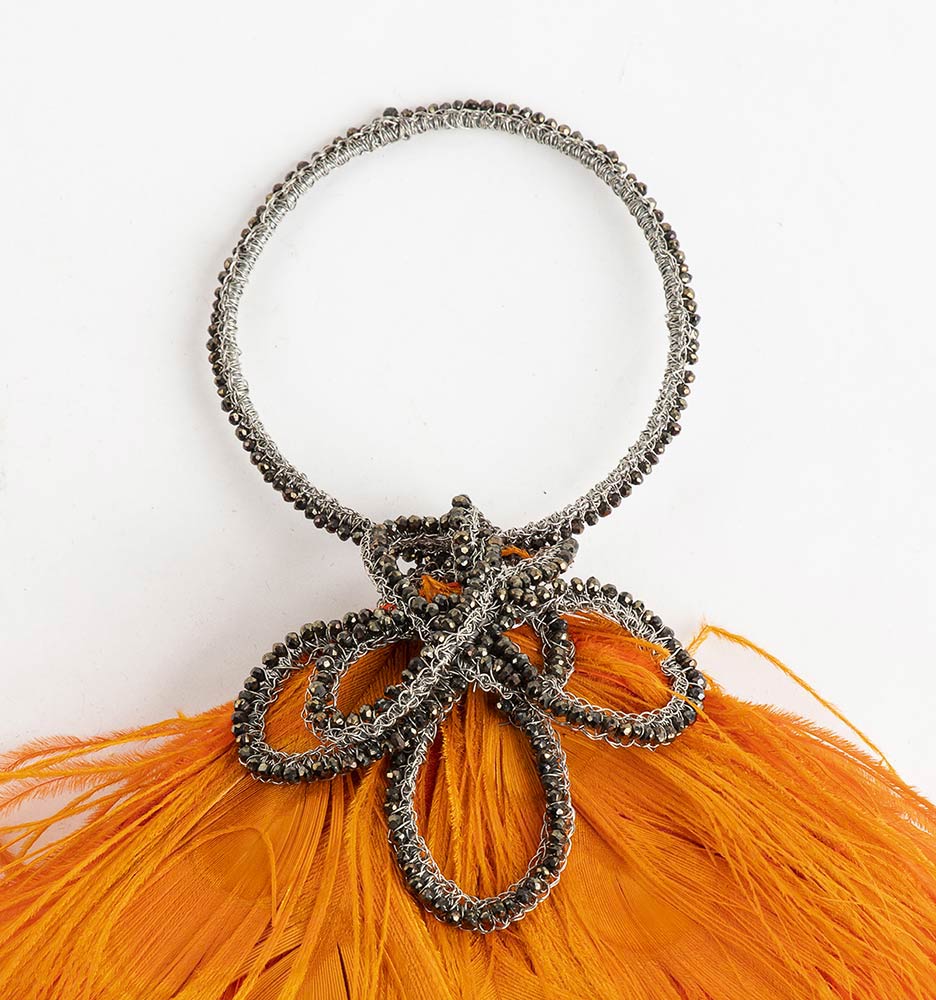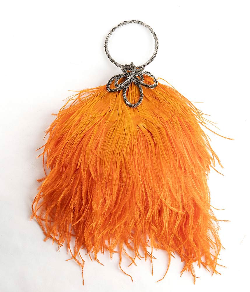 BORSA ARANCIONE IN PIUME DI STRUZZO E PAVONE CON CHIUSURA BRACCIALE IN FILIGRANA DI FERRO E PIRITE