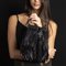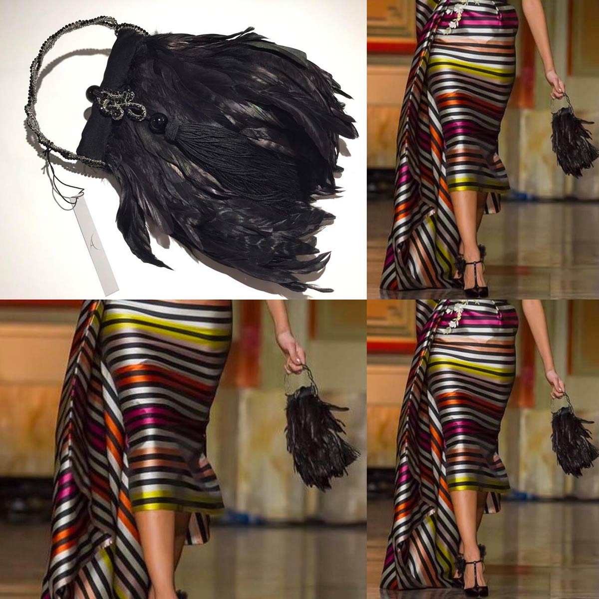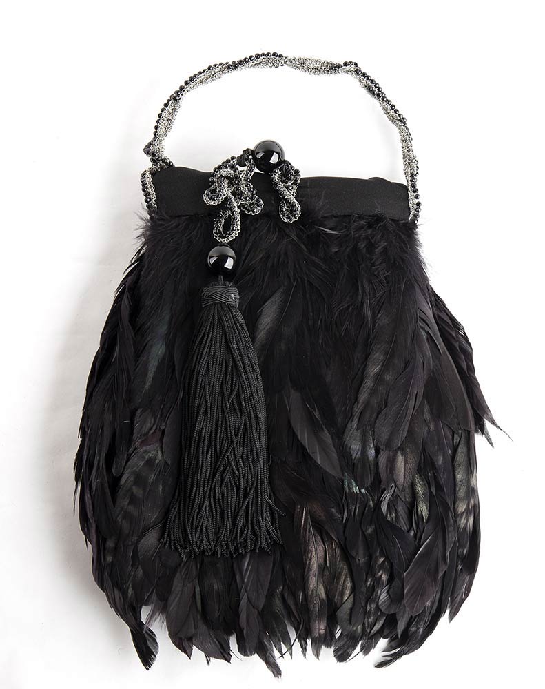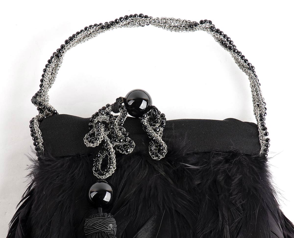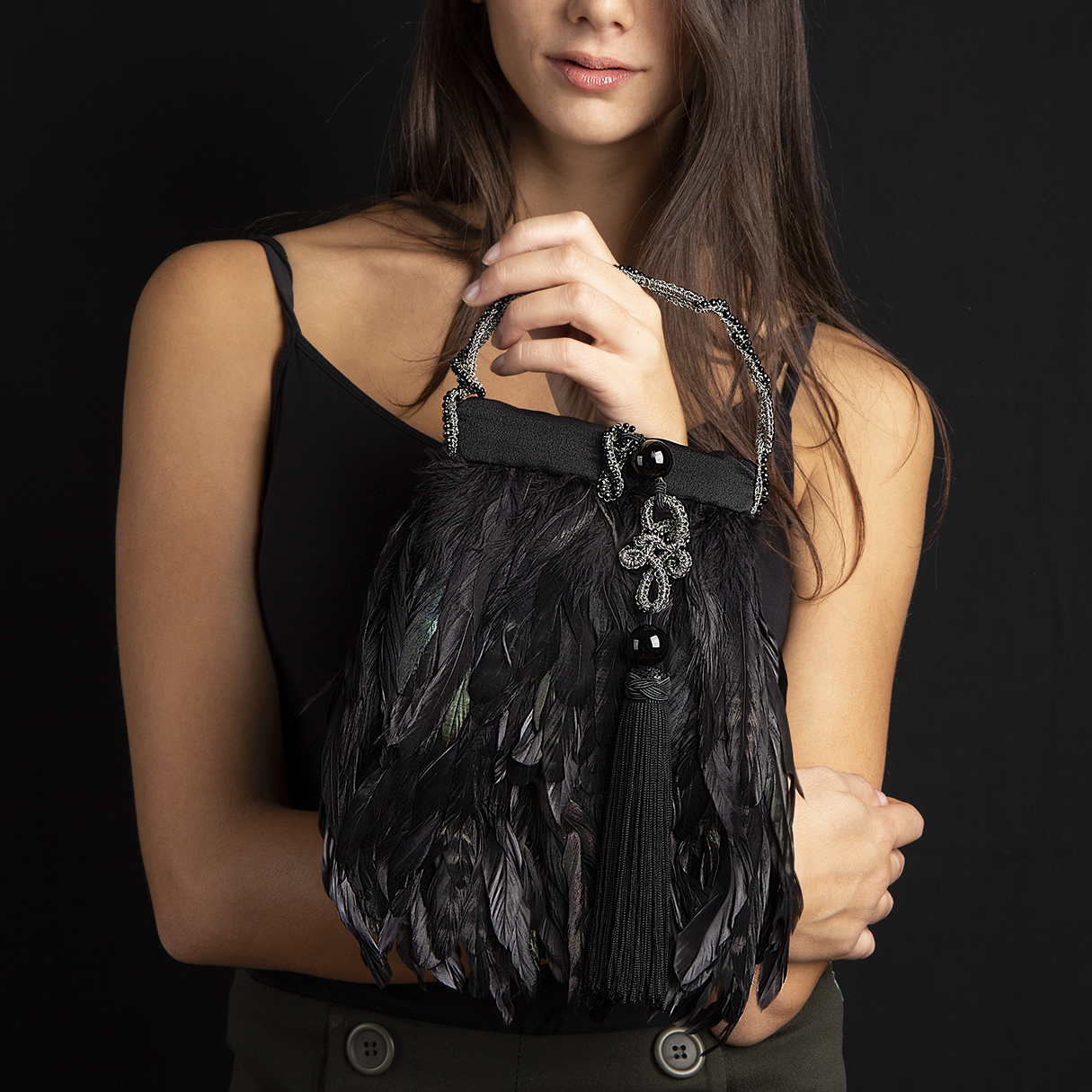 BORSA IN PIUME DI GALLETTO NERO CON MANICO GIOIELLO IN FILIGRANA DI FERRO E ONICE