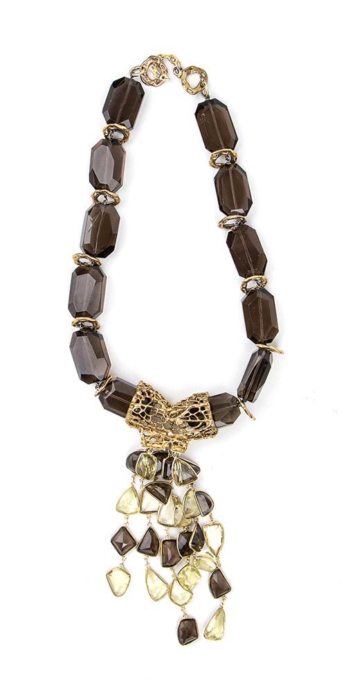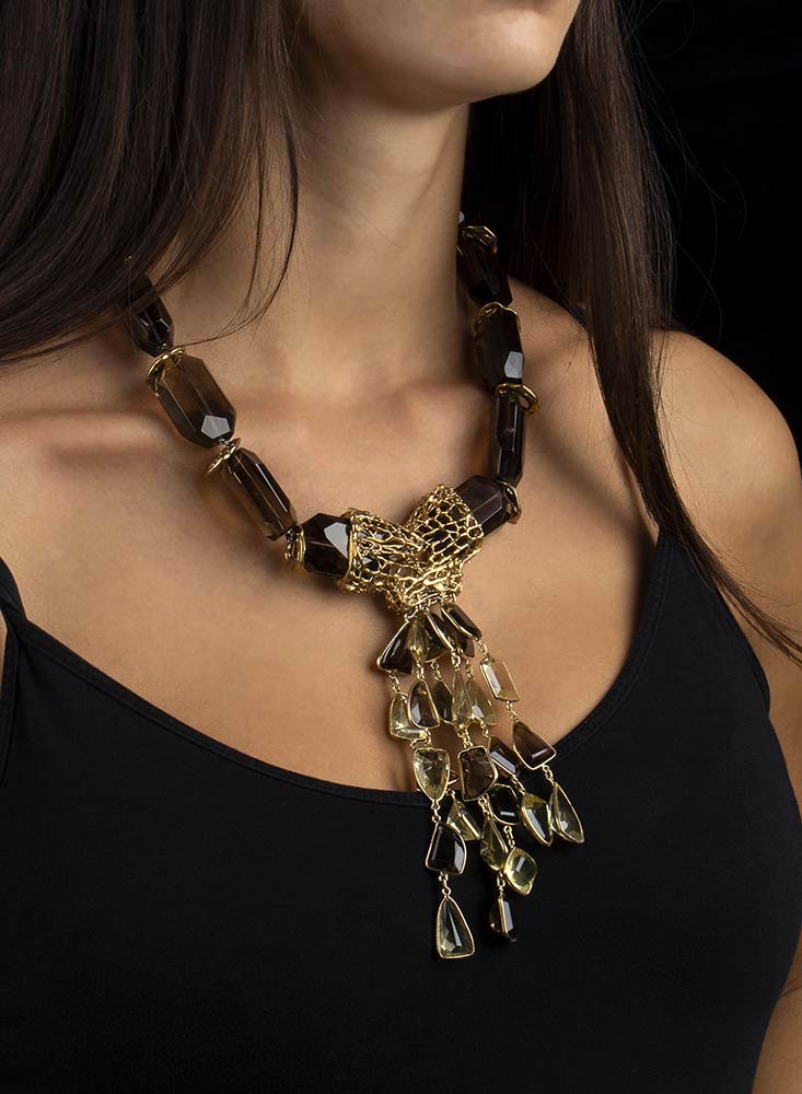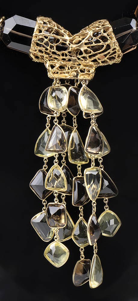 Collana costituita da 12 topazi fumé - Lunghezza 44 cm Pendente a cascata di 6 fili di citrini lemon e topazi fumé - Lunghezze dei fili tra 10 e 11 cm Elemento di raccordo tra la collana e il pendente: fusione in bronzo bagnato in oro 18 kt che mostra il motivo distintivo del marchio: il “sea fan”, lo scheletro della gorgonia di mare