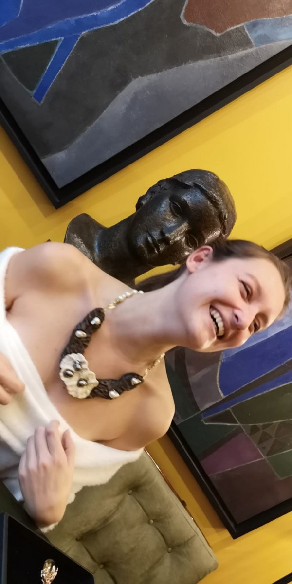 Un filo di perle barocche australiane – Lunghezza 26 cm Plastron composto da una scultura in mogano inciso con quattro perle barocche australiane e madrepora centrale che incastona tre perle barocche tahiti