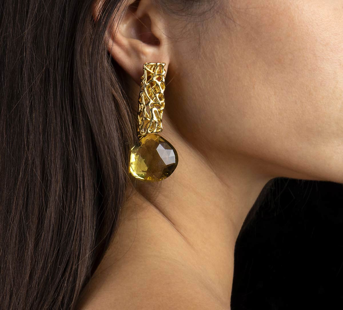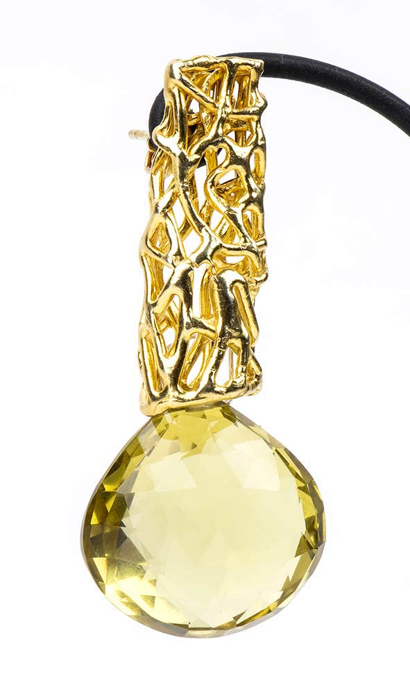 Ogni orecchino è composto da una barra fusa in bronzo bagnato in oro 18 kt che sostiene un citrino lemon. La fusione metallica mostra il motivo distintivo del marchio: il “sea fan”, lo scheletro della gorgonia di mare.