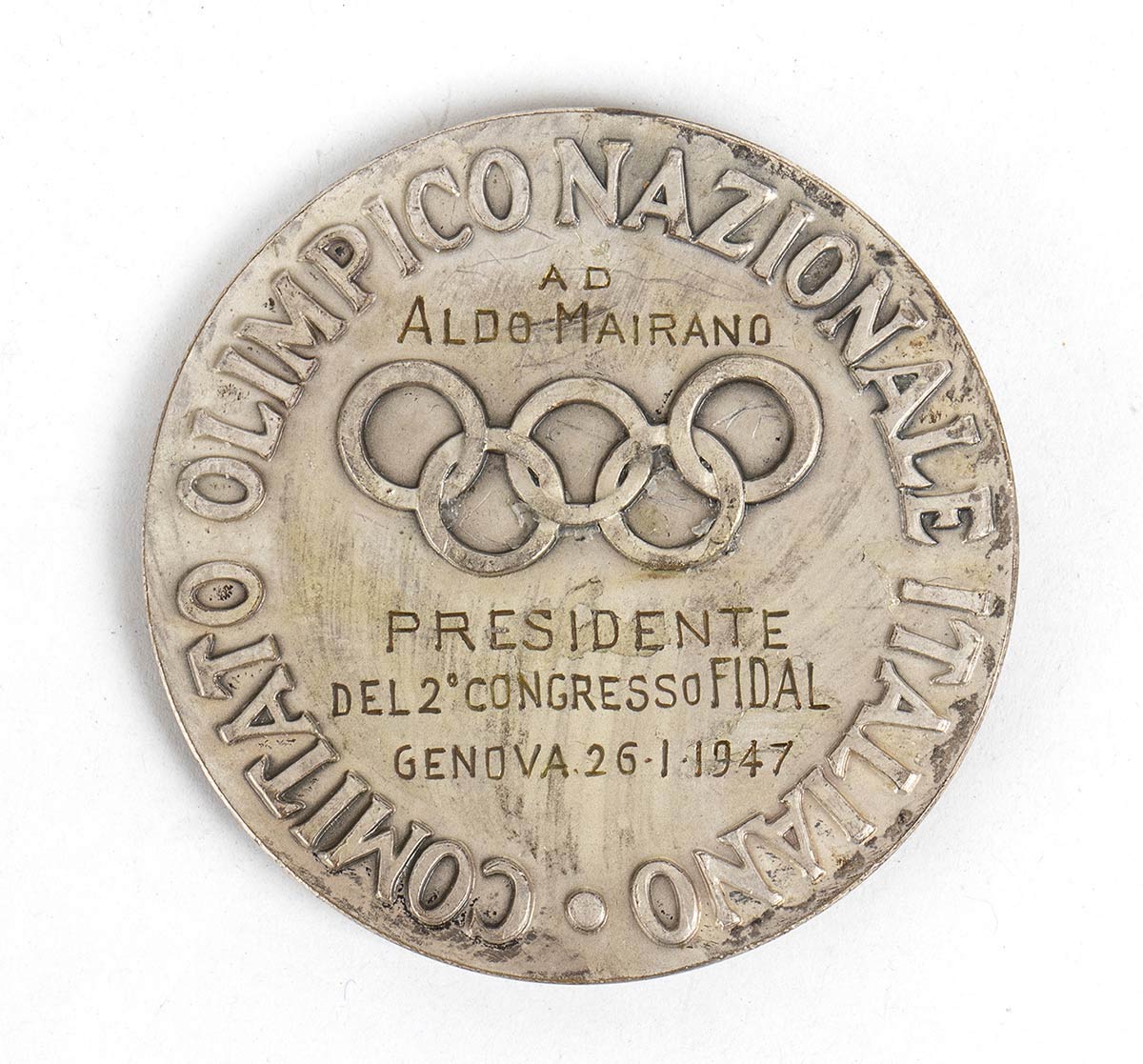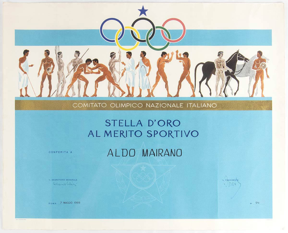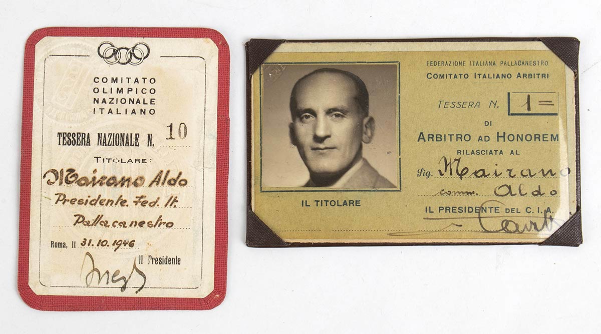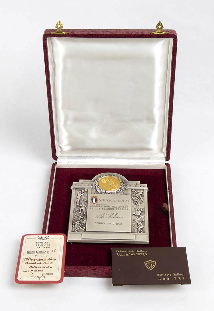 Lotto appartenuto ad Aldo Mairano (1898-1991), dirigente sportivo di calcio e di pallacanestro. Il lotto è composto da una medaglia ufficiale del CONI in scatola originale, firmata MANETTI nominativa ad ALDO MAIRANO PRESIDENTE DEL 2' CONGRESSO FIDAL di Genova del 1947; un attestato del CONI n.94 per la STELLA D'ORO AL MERITO SPORTIVO del 1969 firmato da Giulio Onesti; una tessera numero 1 di Arbitro di Pallacanestro; una tessera del CONI di presidente della Federazione di Pallacanestro; una placca in metallo nominativa MEXICO 1968, in scatola.