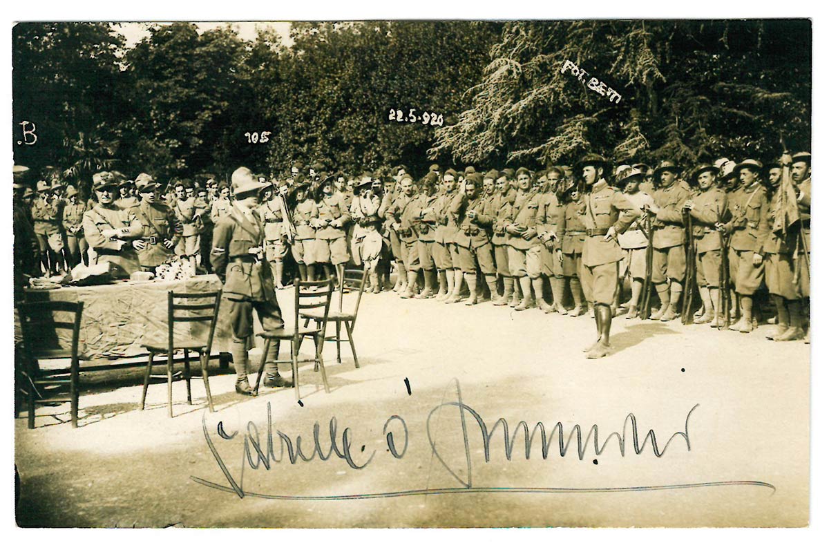 D'Annunzio, Gabriele (1863-1938) - Fotografia di un bel gruppo di legionari fiumani, bersaglieri, arditi, adunati ad ascoltare Gabriele d'Annunzio, periodo 1919 1920. La fotografia è autografata di pugno dal Vate, firma ben visibile nella parte centrale dell'immagine. Dimensioni circa cm.10x15