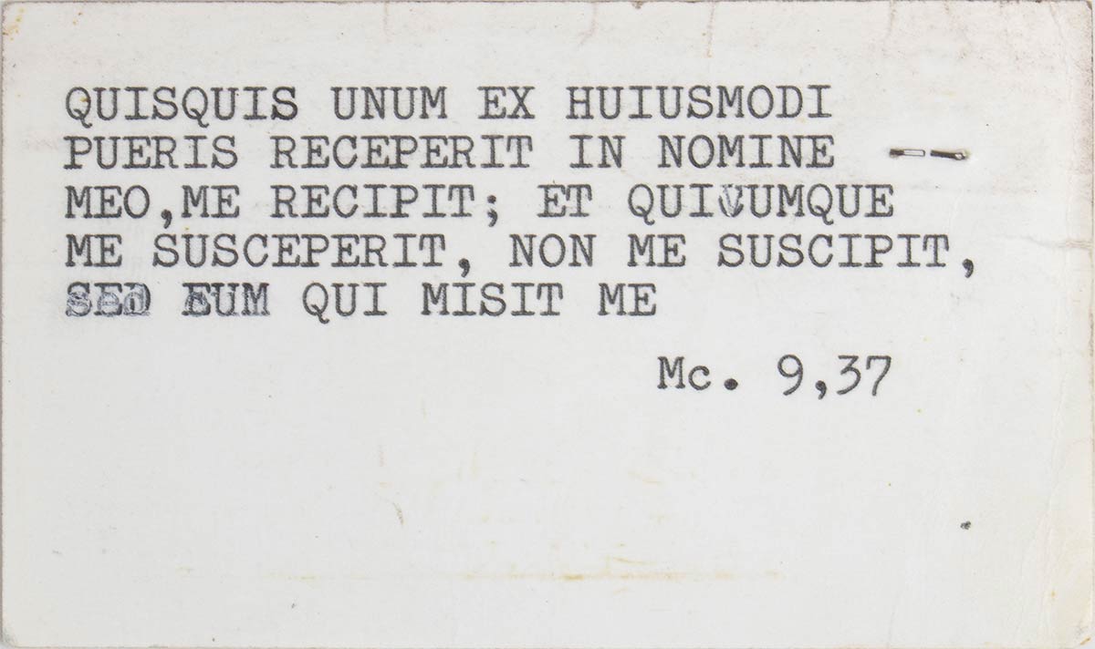 Piccolo lembo di cotone bianco ritagliato presumibilmente da una fascia appartenuta a Padre Pio, come indicato dalla nota autografa riportata sul biglietto da visita di Don Giorgio d'Avack, fondatore dell'Opera Regina Apostolorum ORA.