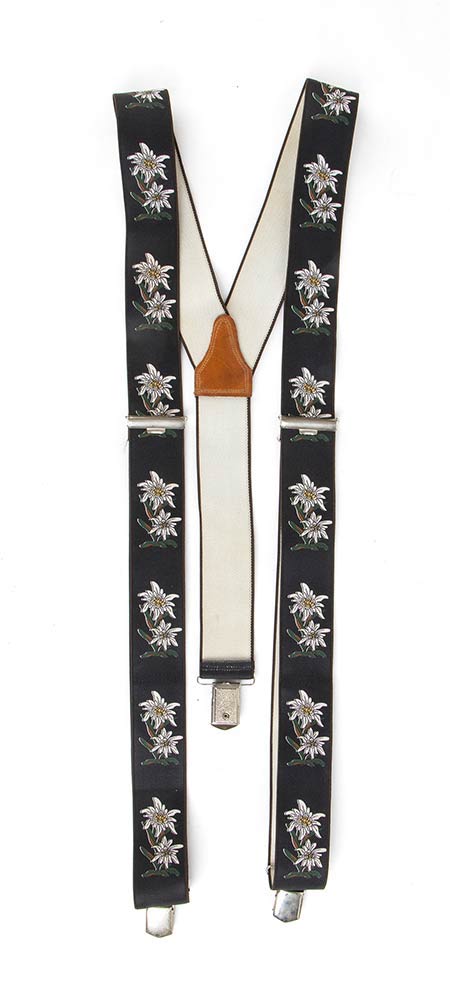 Paio di bretelle appartenute a Freddie Mercury, in cotone elasticizzato, con disegni stampati di Stelle Alpine su sfondo nero. Le bretelle erano l'accessorio di abbigliamento per eccellenza usato da Freddie Mercury, e quelle con disegni di fiori, stelle alpine, cristalli di ghiaccio sono le più note. Il lotto fa parte di una serie di oggetti appartenuti a Freddie Mercury, e regalati da Jim Hutton (1949-2010, ultimo compagno di Freddie Mercury) ad una fan italiana amica dello stesso Jim, nel 1995/96. Viene fornita una fotografia della fan con Jim Hutton ed una lettera a lei indirizzata dallo stesso Hutton.