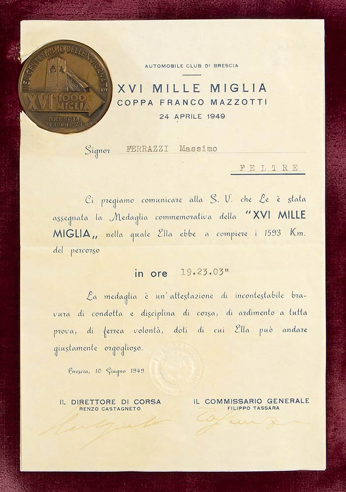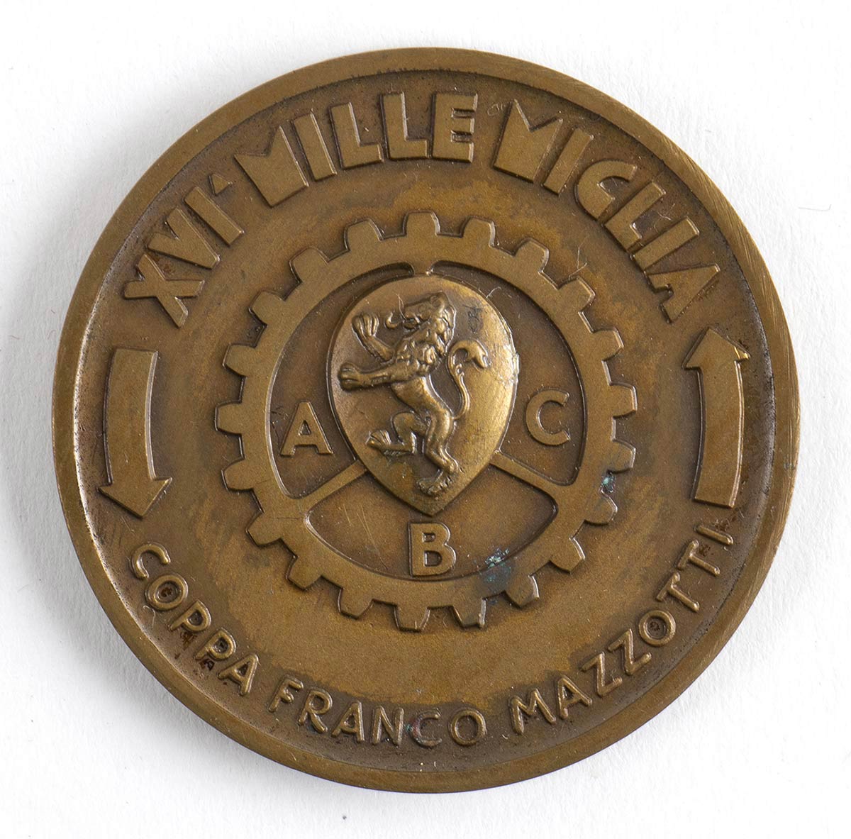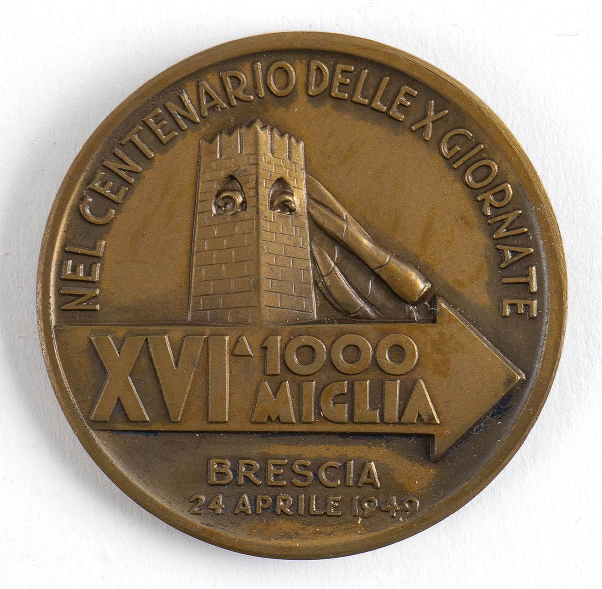 Medaglia in bronzo per la XVI Mille Miglia - Coppa Franco Mazzotti del 1949. Assegnata con attestato di partecipazione, Automobile Club di Brescia. Dello stesso corridore di cui abbiamo la coppa in asta. La medaglia misura circa mm.45 di diametro. Attestato applicato su basetta in legno rivestita di velluto bordeaux, con ritaglio circolare per alloggiare la medaglia.