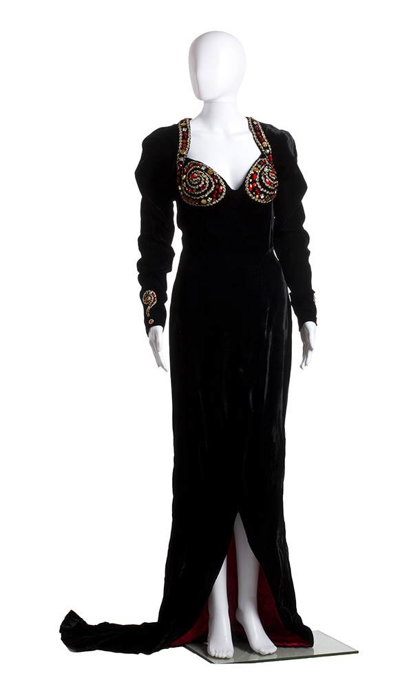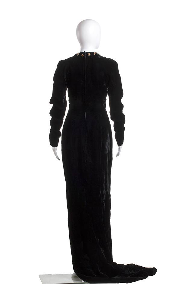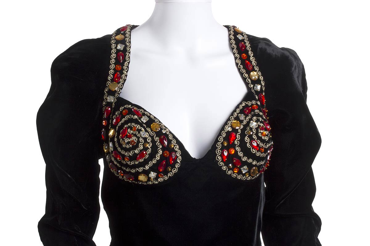 Abito sa sera in velluto nero, appartenuto a Marina Ripa di Meana. Corpino e polsi ricamati con pietre in plastica colorate e filo dorato, piccolo strascico,zip posteriore,manica lunga,fodera in raso rosso. Busto 85cm, vita 70cm