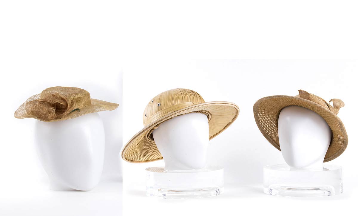 Lotto di tre cappelli appartenuti a Marina Ripa di Meana : cappello stile safari in paglia color naturale, circonferenza 54 cm ; cappello in paglia color naturale con fiocco, circonferenza 56 cm; cappello in sinamay beige, circonferenza 40 cm