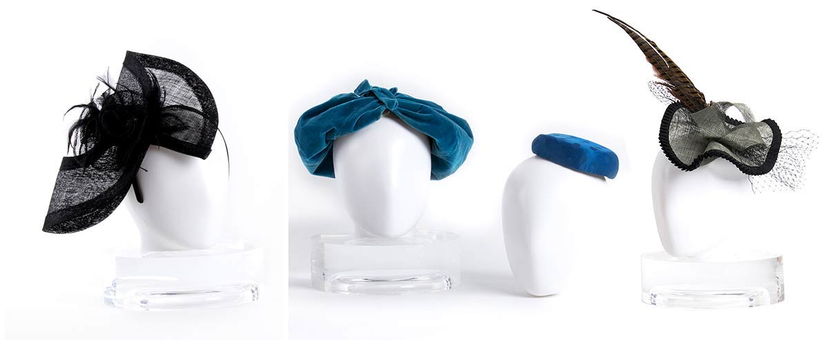 Lotto di quattro cappelli appartenuti a Marina Ripa di Meana : cappello a turbante in velluto turchese, circonferenza 64 cm ; un cappello pillbox in seta turchese a pois, circonferenza 20 cm ; un cappello a cerchietto asimmetrico in sinamay nero, piume nere, 21L x 21A cm; un cappello in sinamay grigio profilato in seta nera con veletta in tulle e piume, 55L x 34A cm